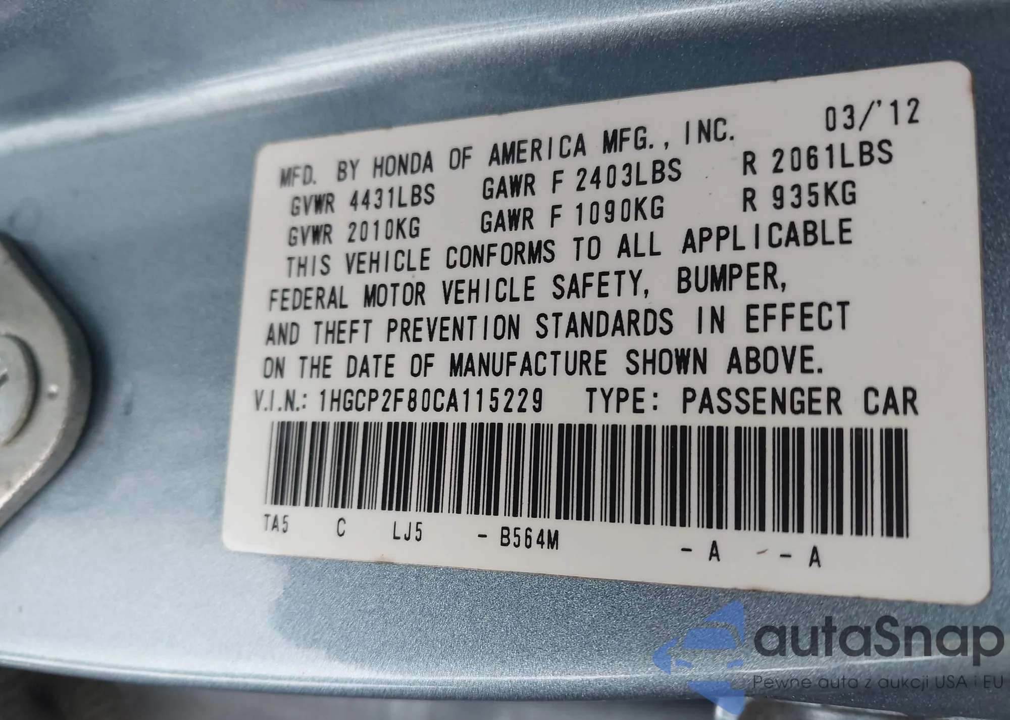 • VIN 1HGCP2F80CA115229