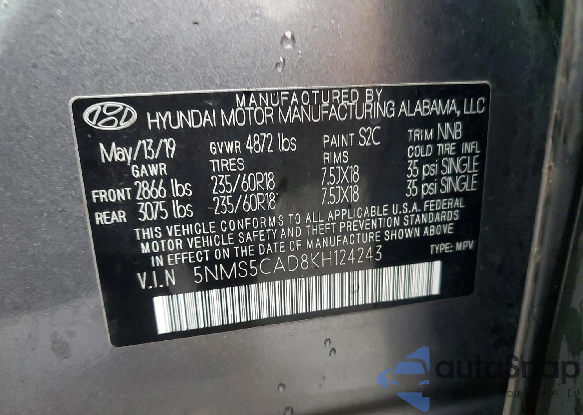 LOT: 78310265 VIN: 5NMS5CAD8KH124243