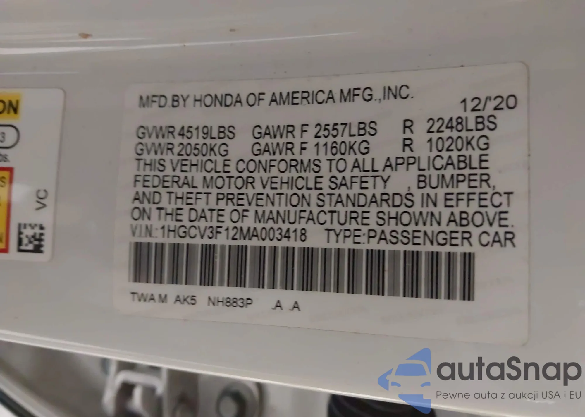 LOT: 44370925 VIN: 1HGCV3F12MA003418