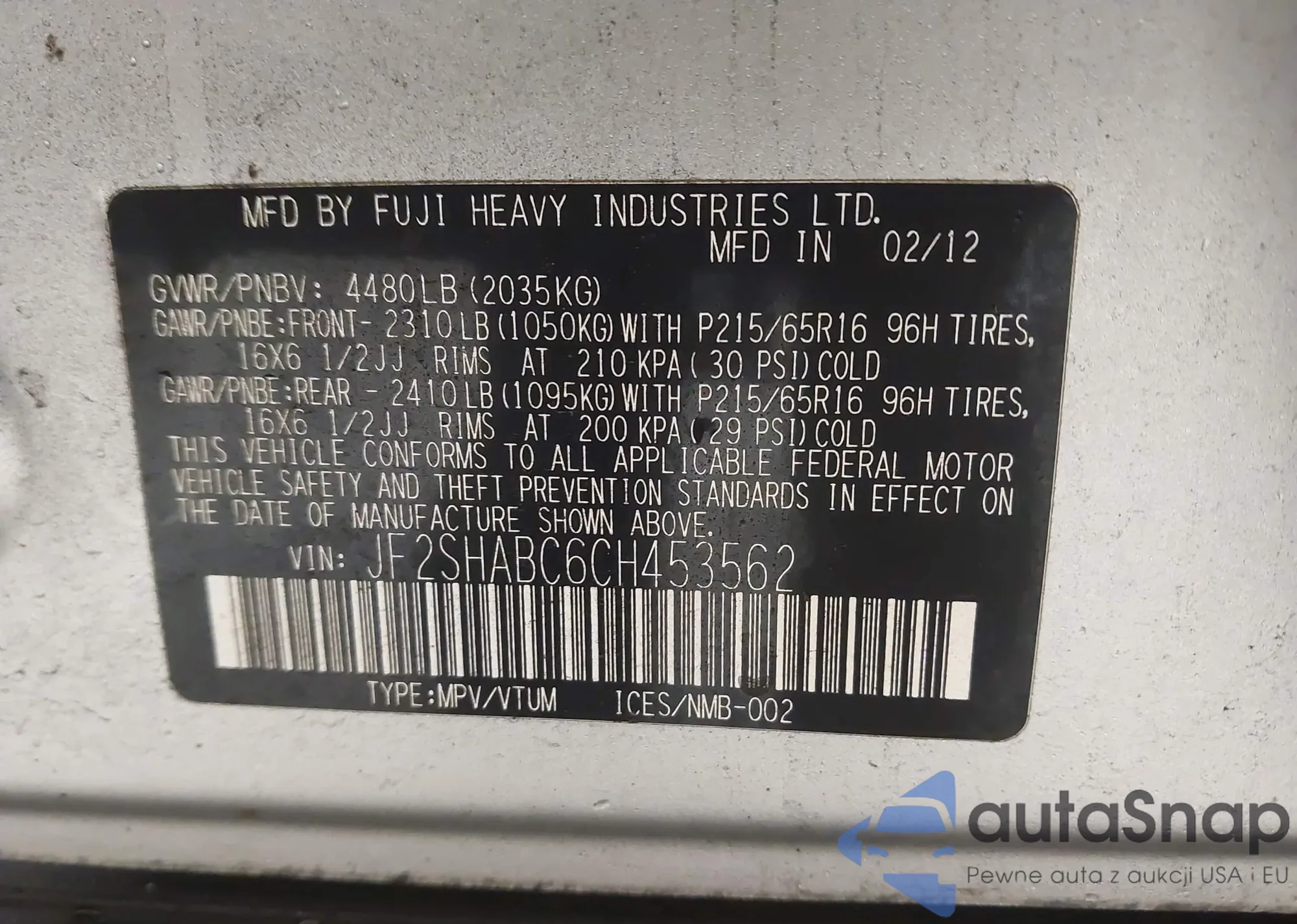 LOT: 44511523 VIN: JF2SHADC2BH723205