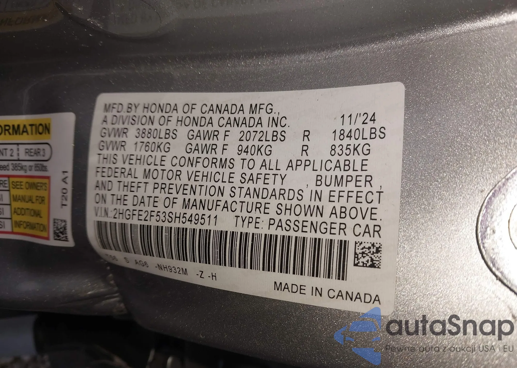 • VIN 2HGFE2F53SH549511