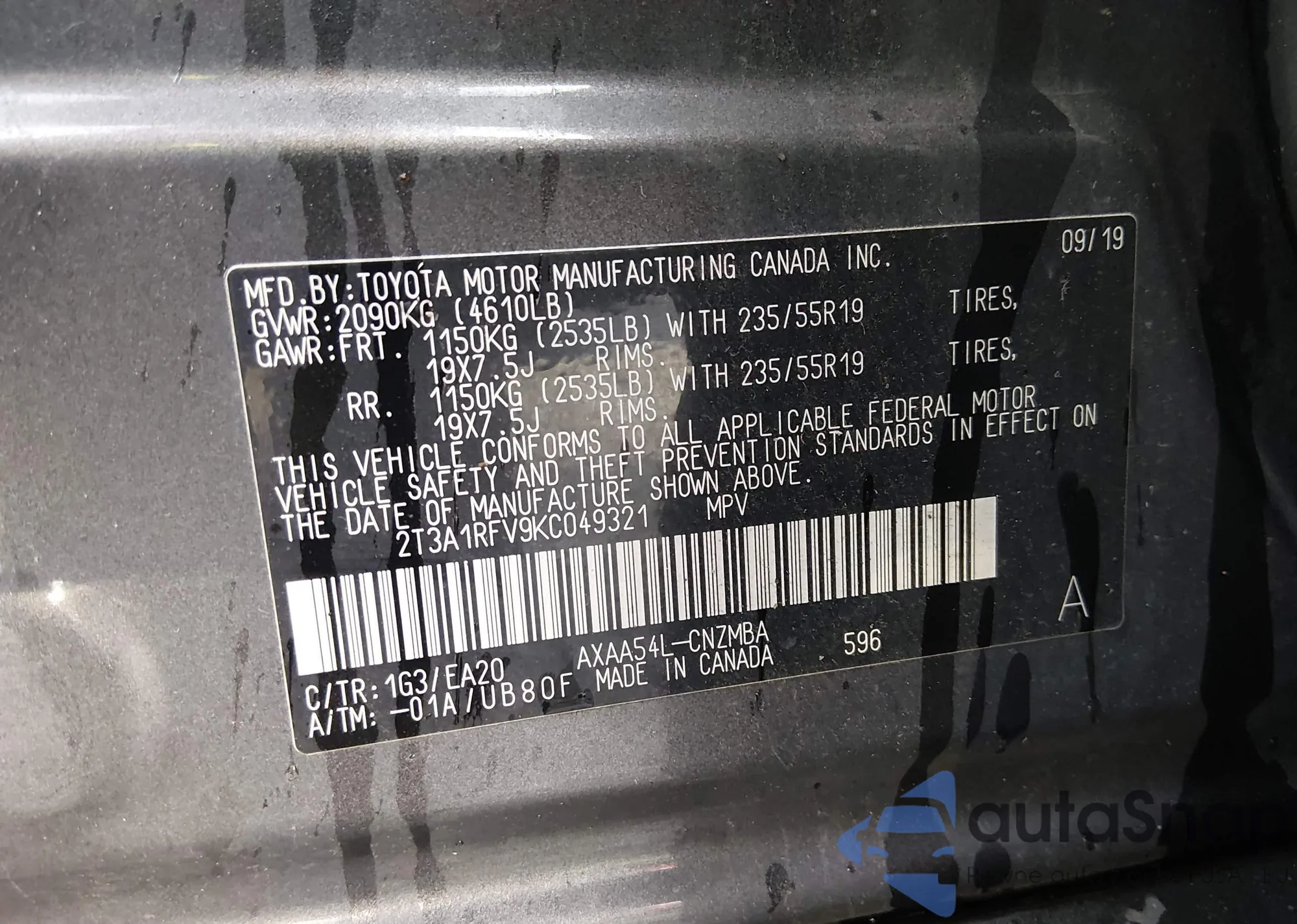 • VIN 2T3A1RFV9KC049321