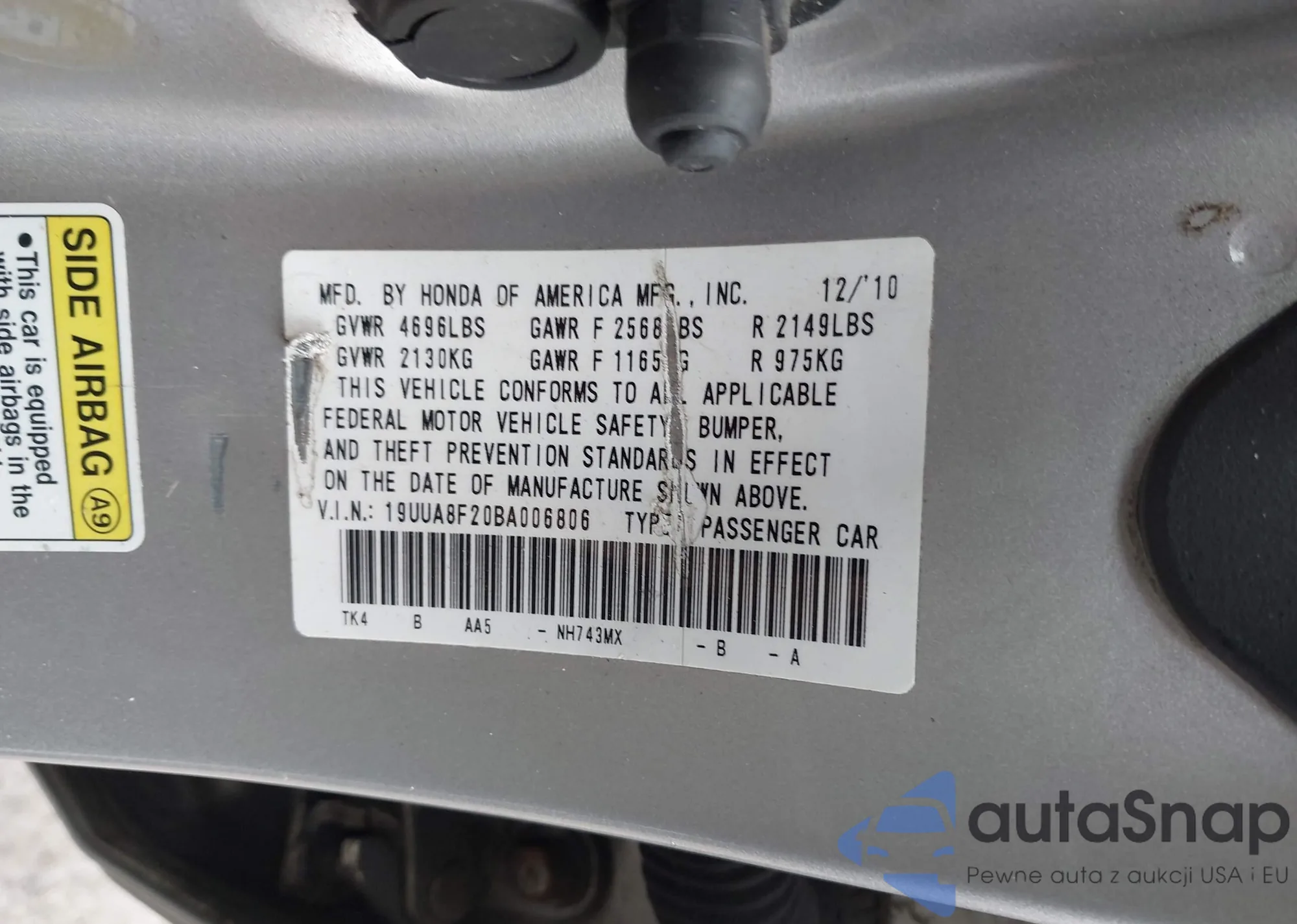 • VIN 19UUA8F20BA006806