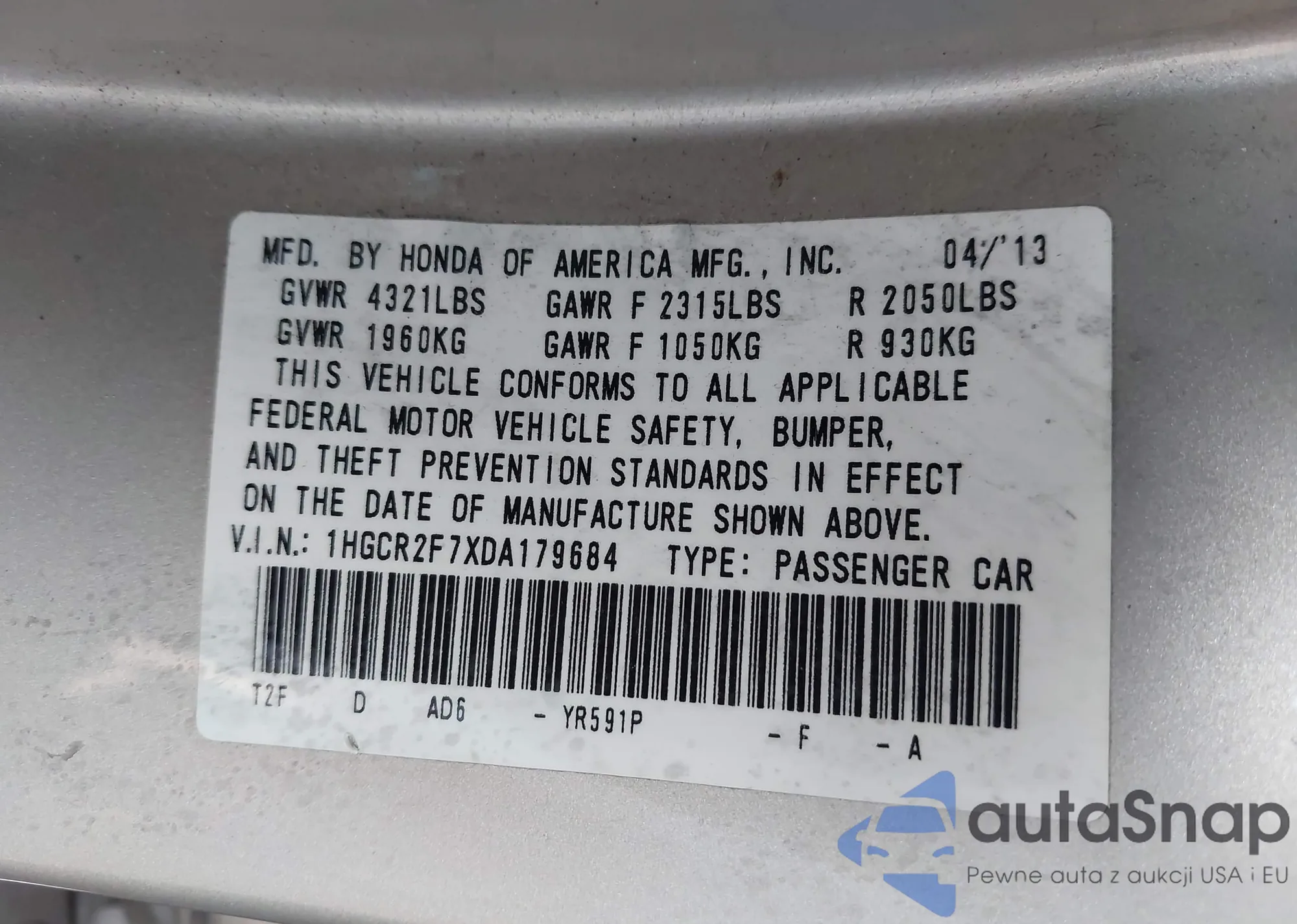 • VIN 1HGCR2F7XDA179684
