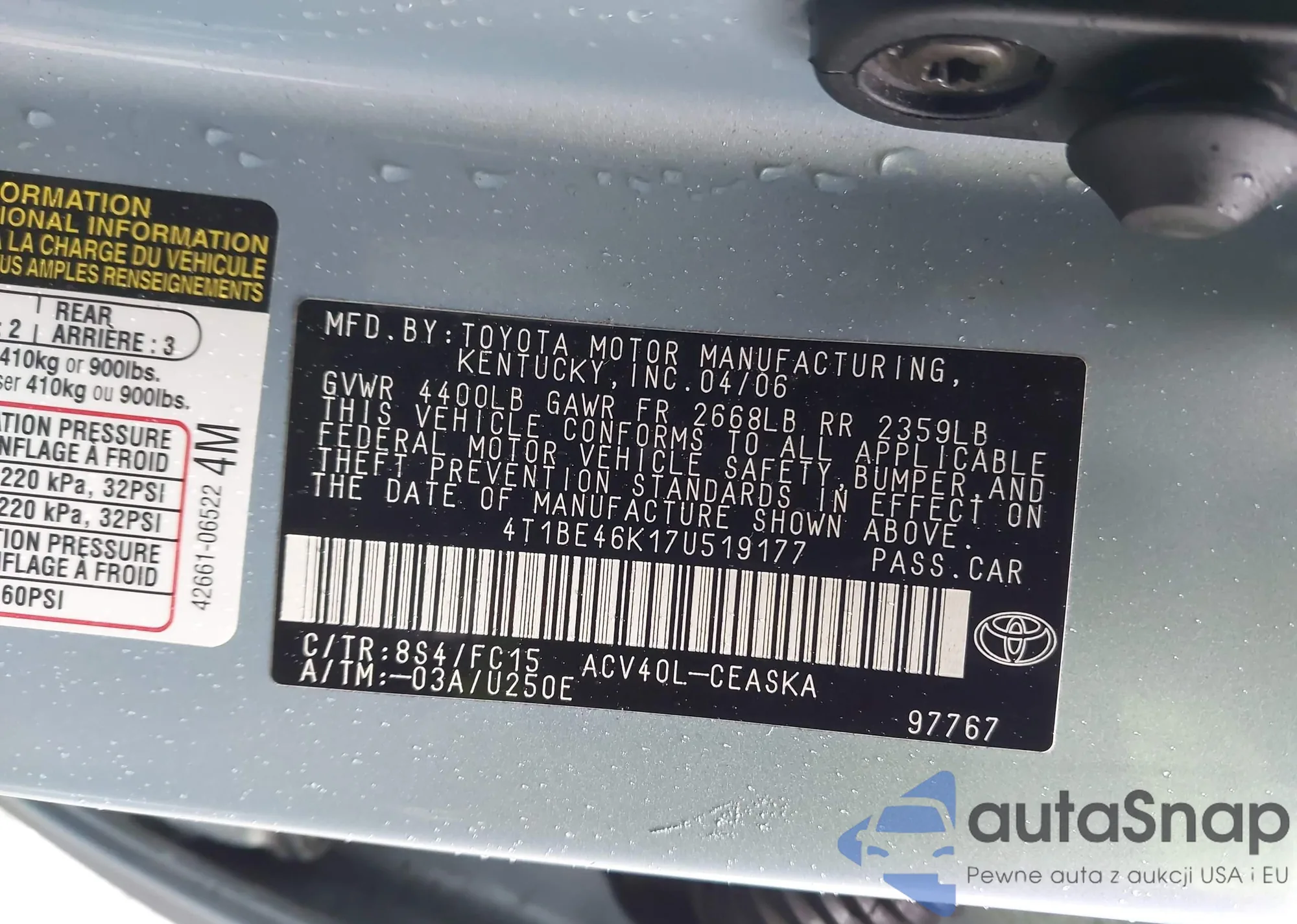 LOT: 44468817 VIN: 4T1BE46K17U519177