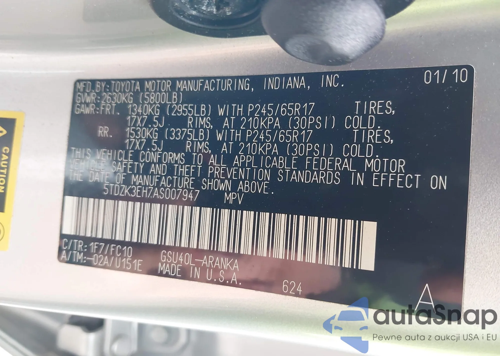 LOT: 44347074 VIN: 5TDZK3EH7AS007947