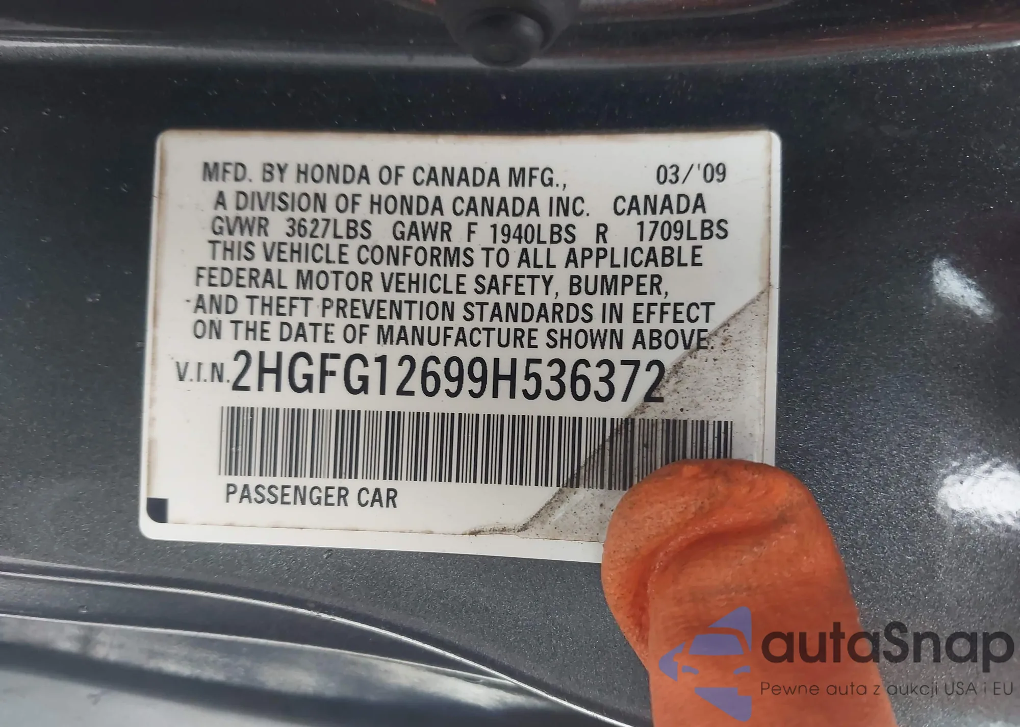 LOT: 44295635 VIN: 2HGFG12699H536372