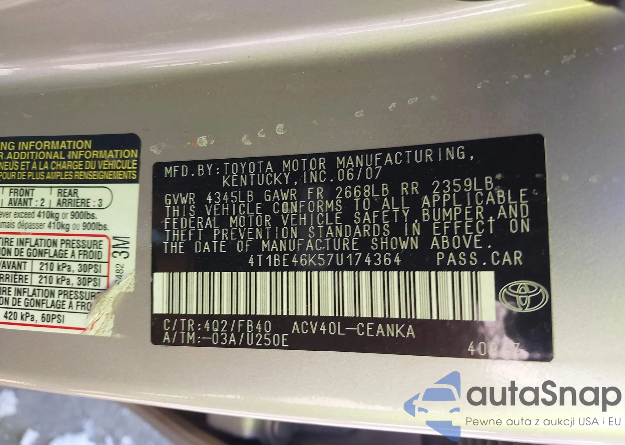 LOT: 44249266 VIN: 4T1BE46K57U174364