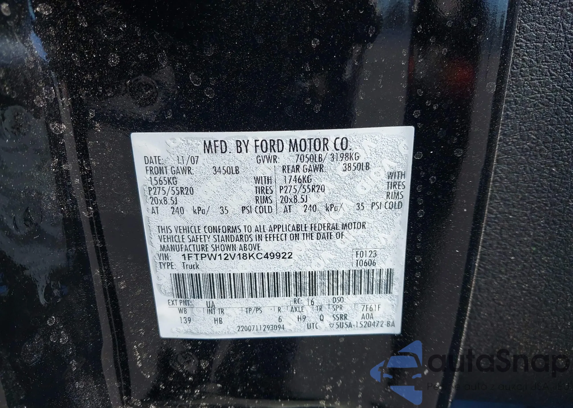 LOT: 44432920 VIN: 1FTPW12V18KC49922