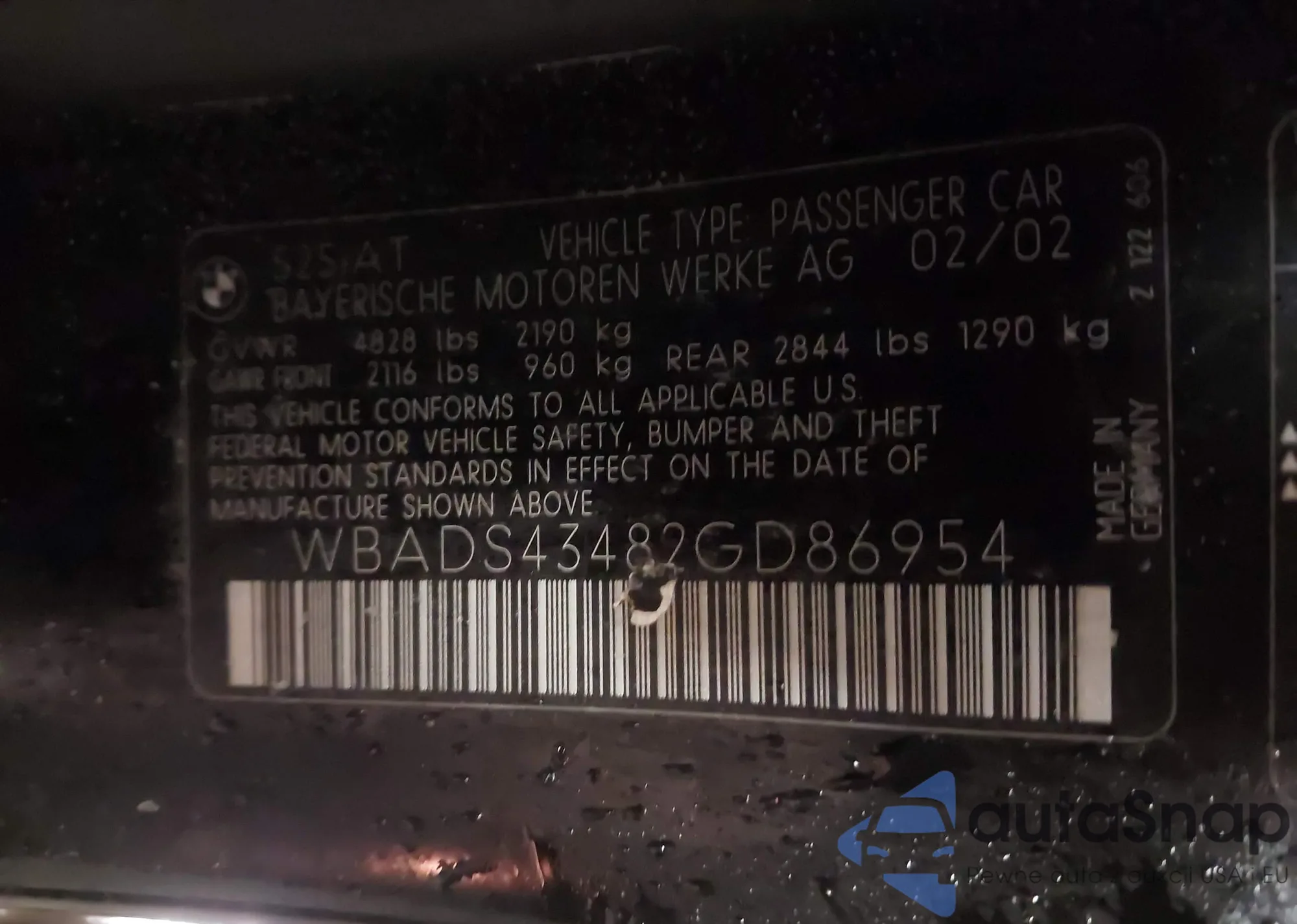 2002 BMW 525Ita from USA, damaged, VIN WBADS43482GD86954