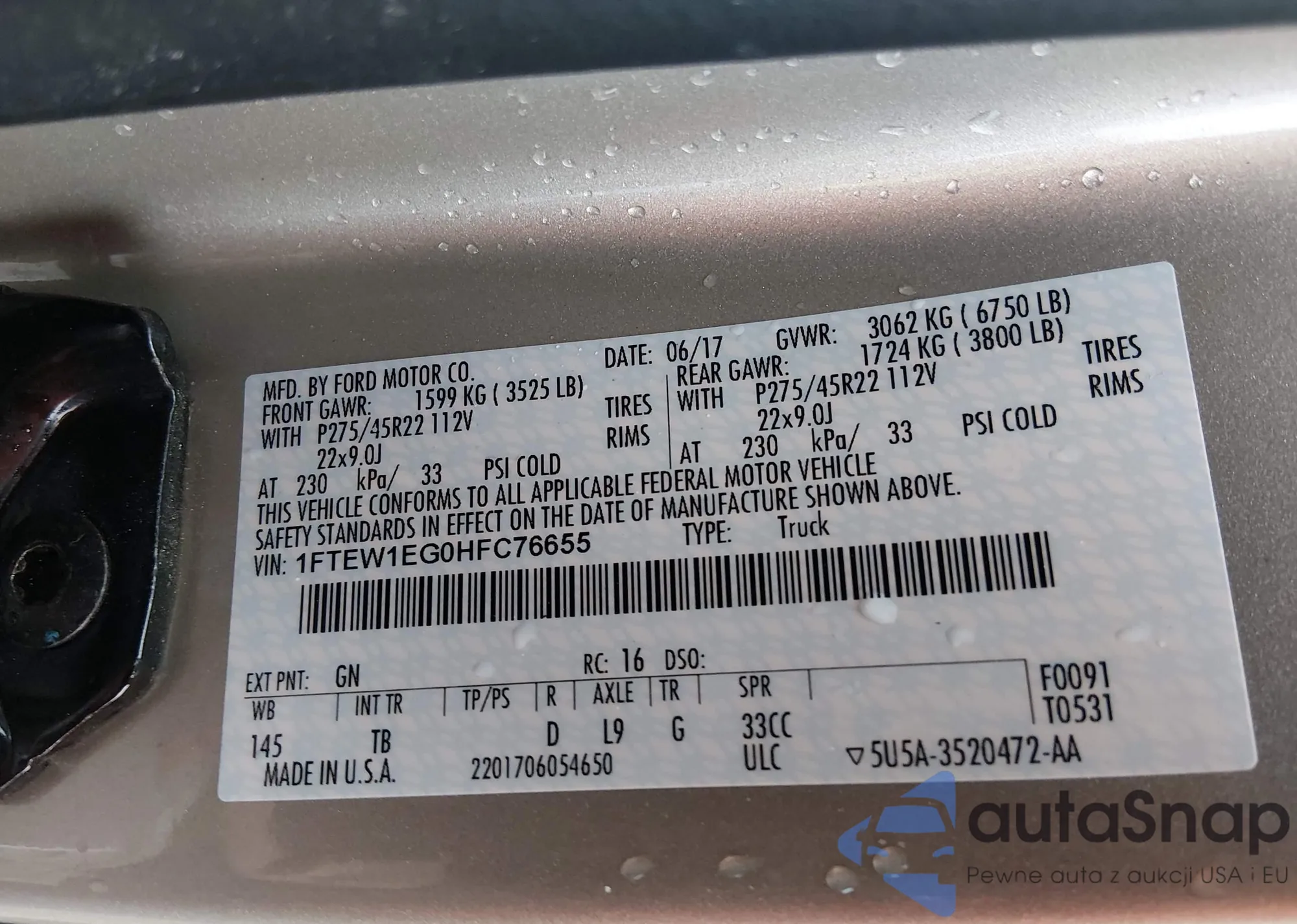 LOT: 44317273 VIN: 1FTEW1EG0HFC76655