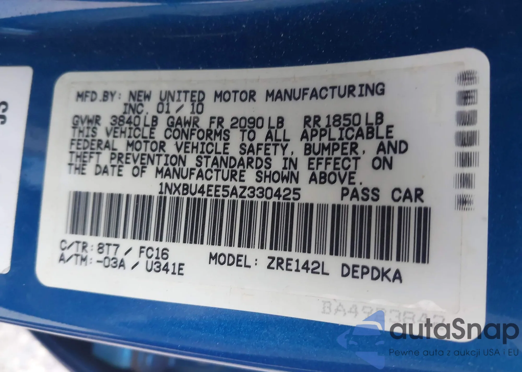 • VIN 1NXBU4EE5AZ330425