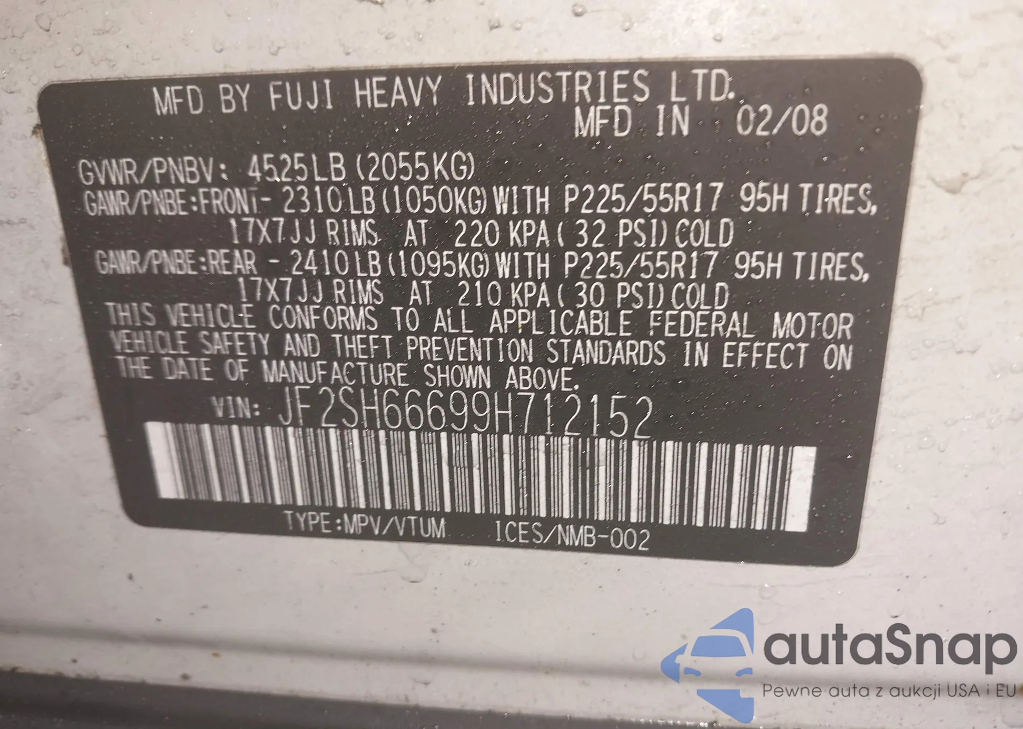 • VIN JF2SH66699H712152