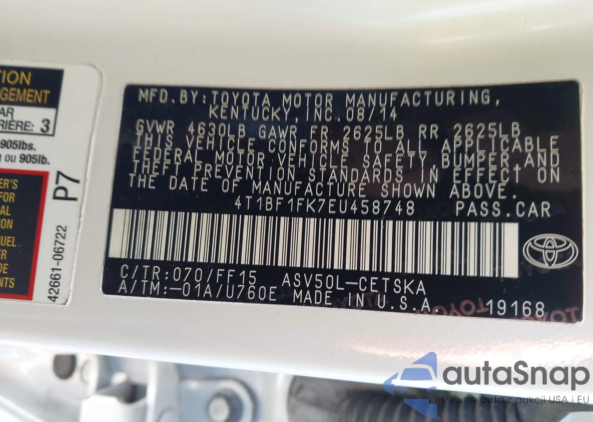 • VIN 4T1BF1FK7EU458748