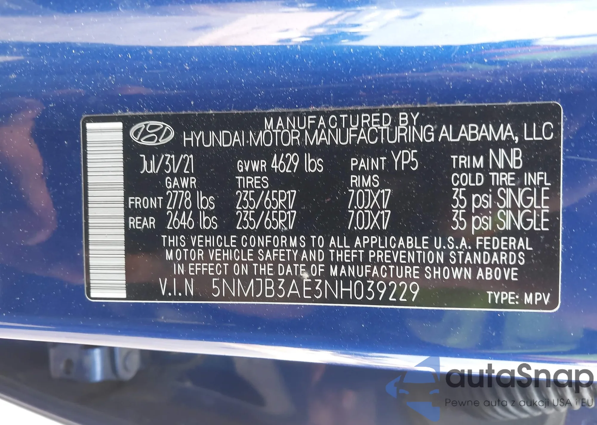 • VIN 5NMJB3AE3NH039229
