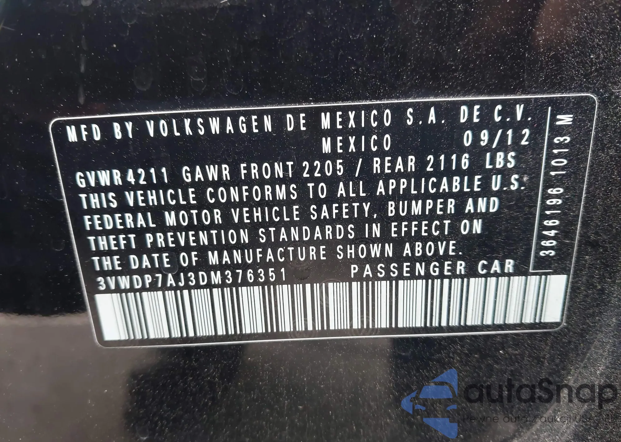 • VIN 3VWDP7AJ3DM376351