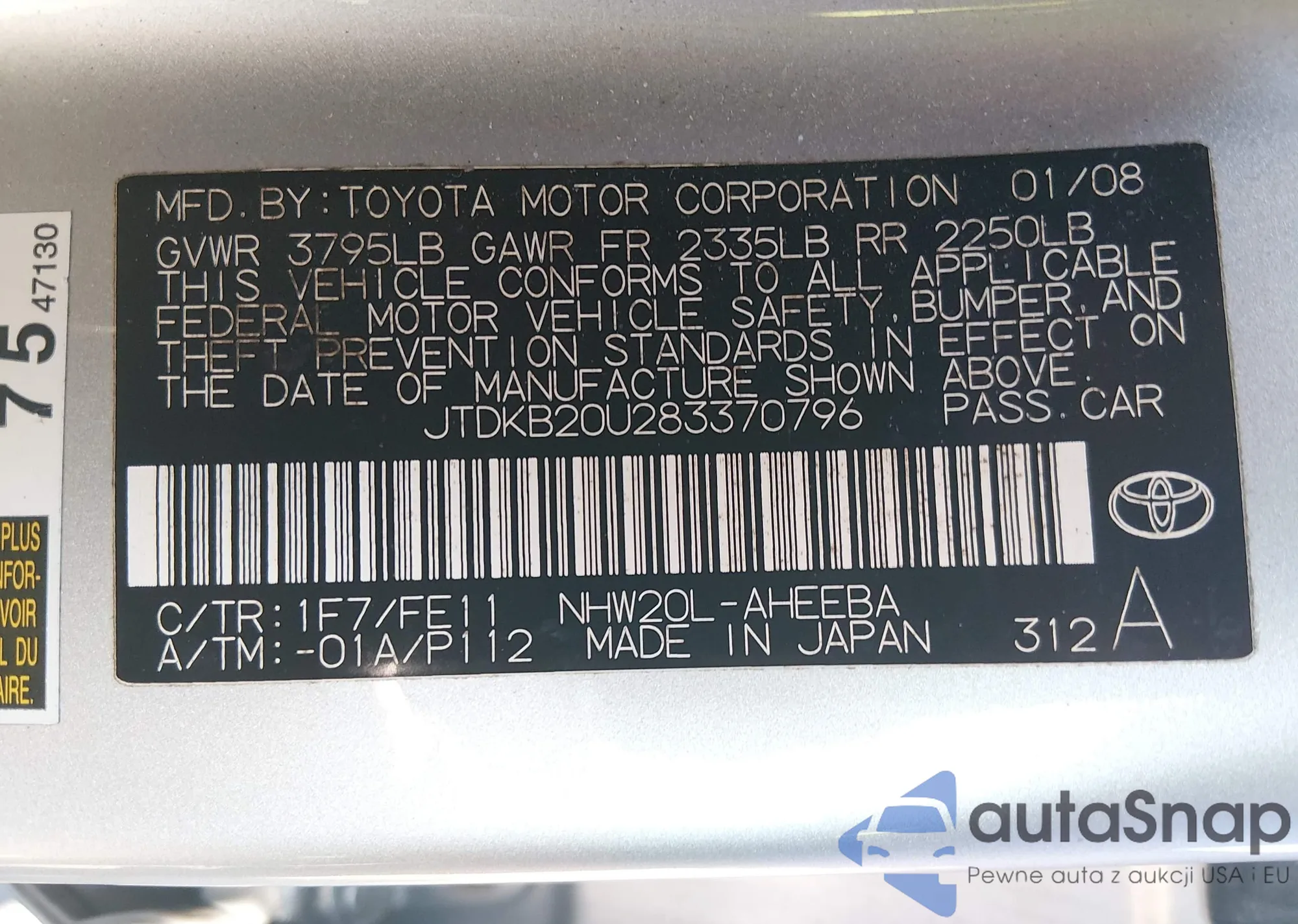 LOT: 44491739 VIN: JTDKB20U283370796
