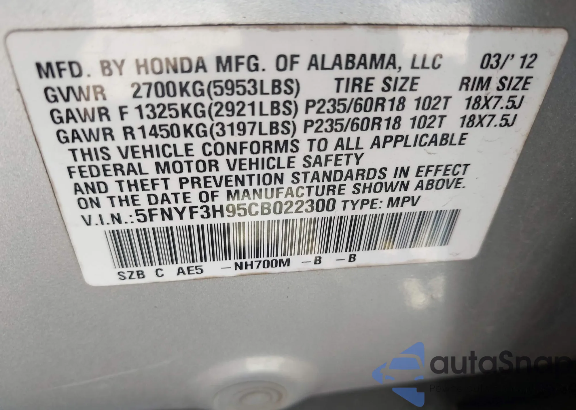 • VIN 5FNYF3H95CB022300