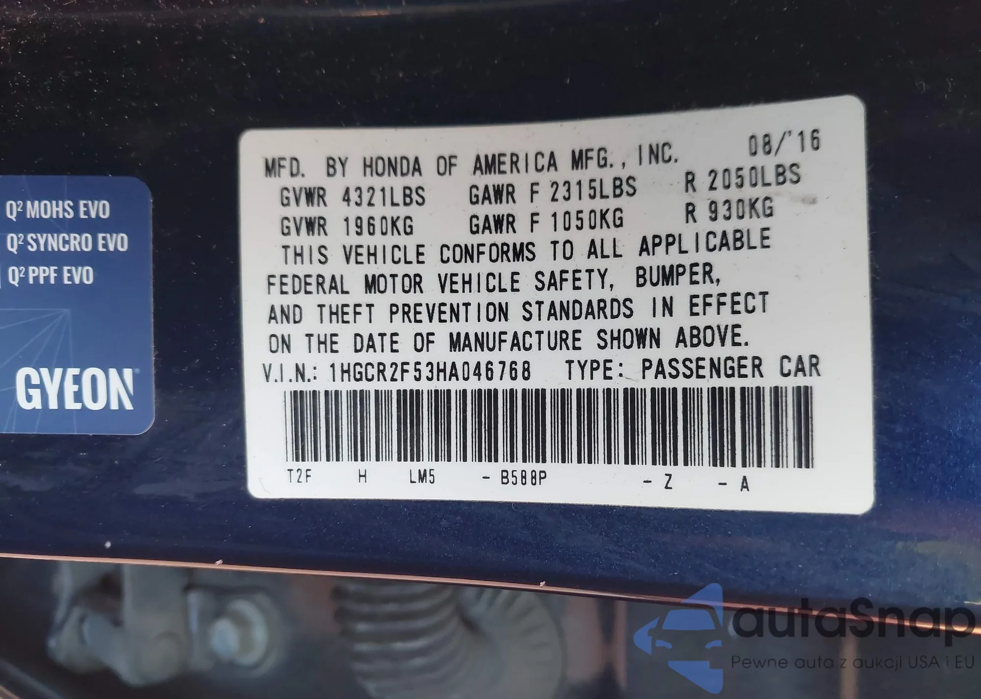 • VIN 1HGCR2F53HA046768