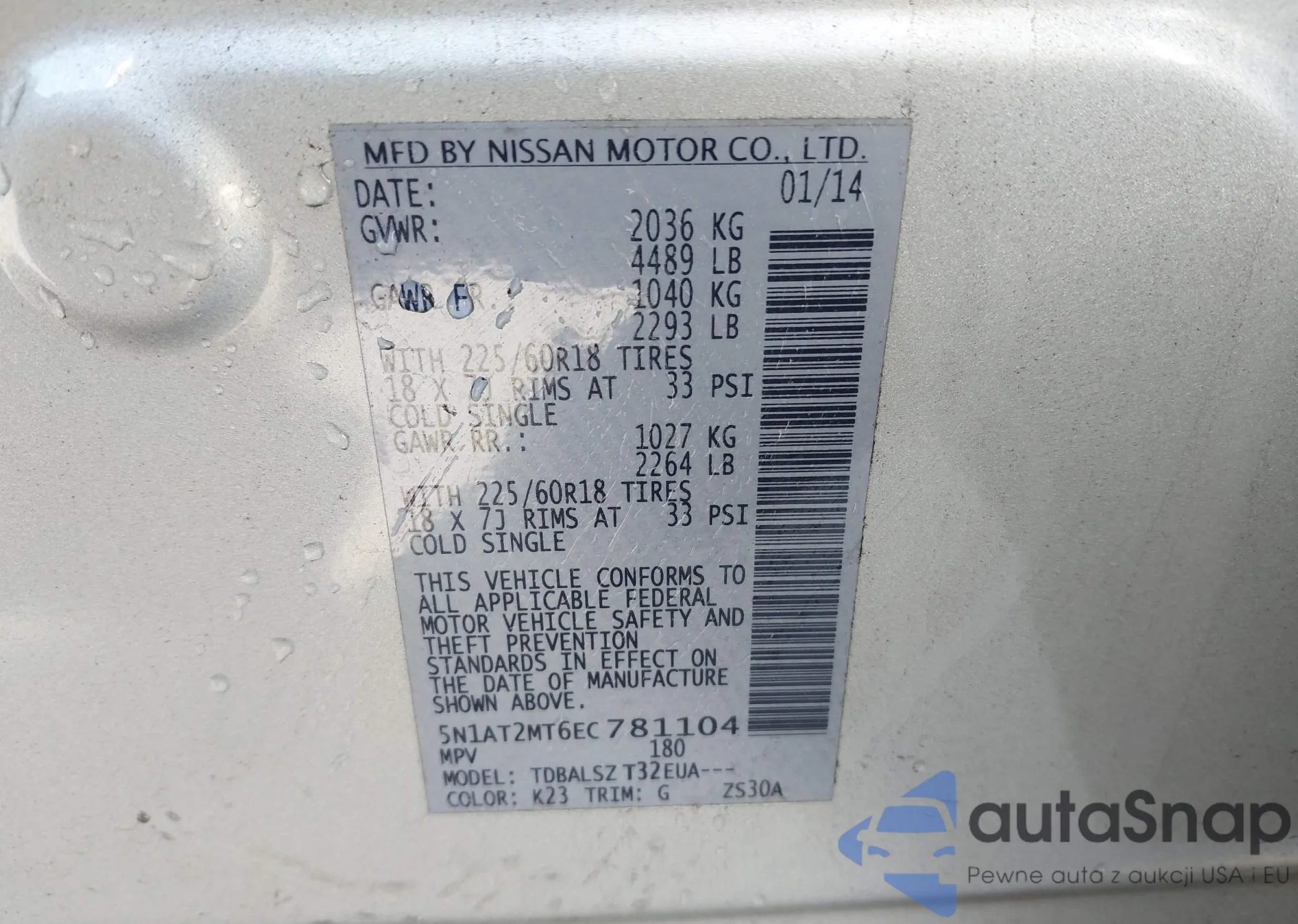 LOT: 43836409 VIN: 5N1AT2MT6EC781104