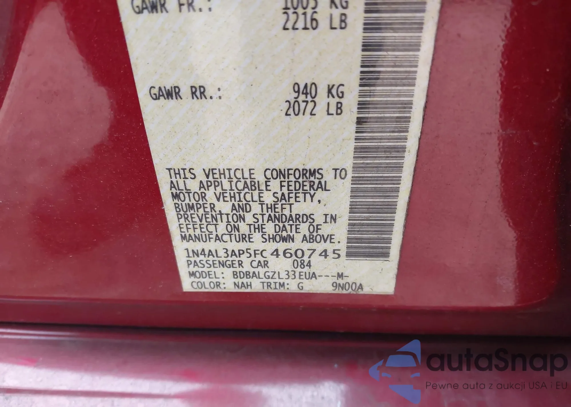LOT: 44232010 VIN: 1N4AL3AP5FC460745
