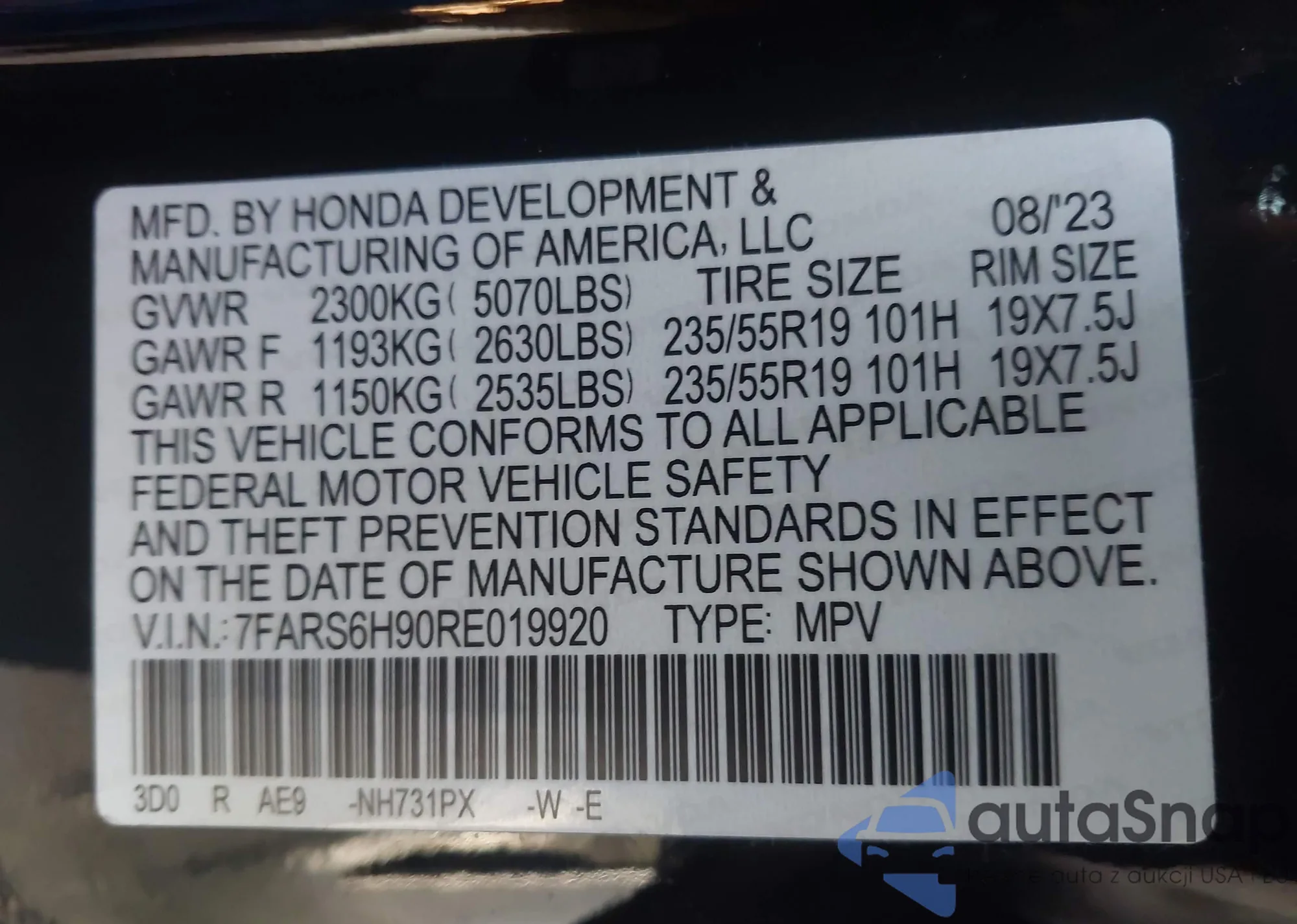LOT: 43890287 VIN: 2HGFE4F87TH311717