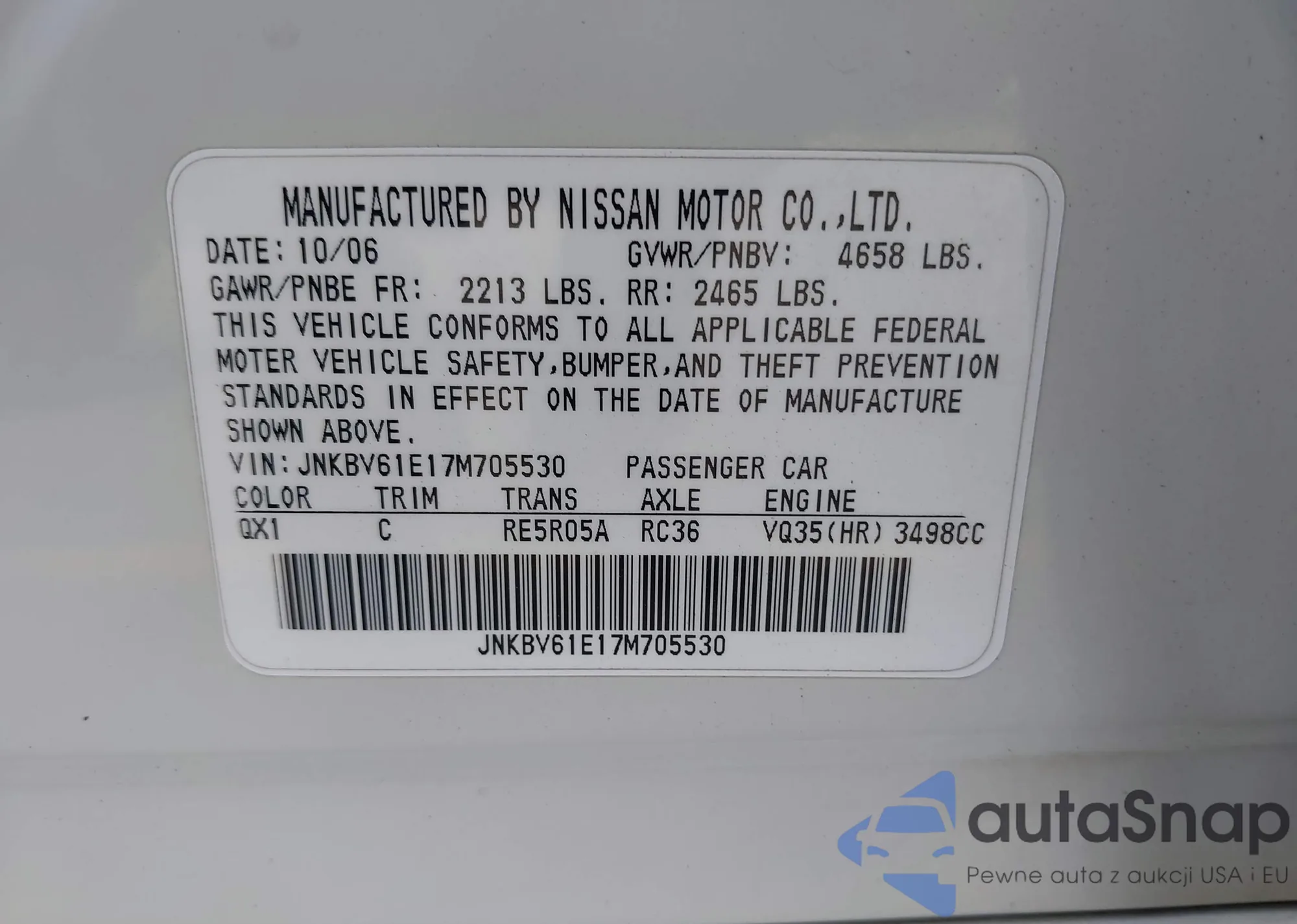 2007 Infiniti G35 Journey from USA, damaged, VIN JNKBV61E17M705530