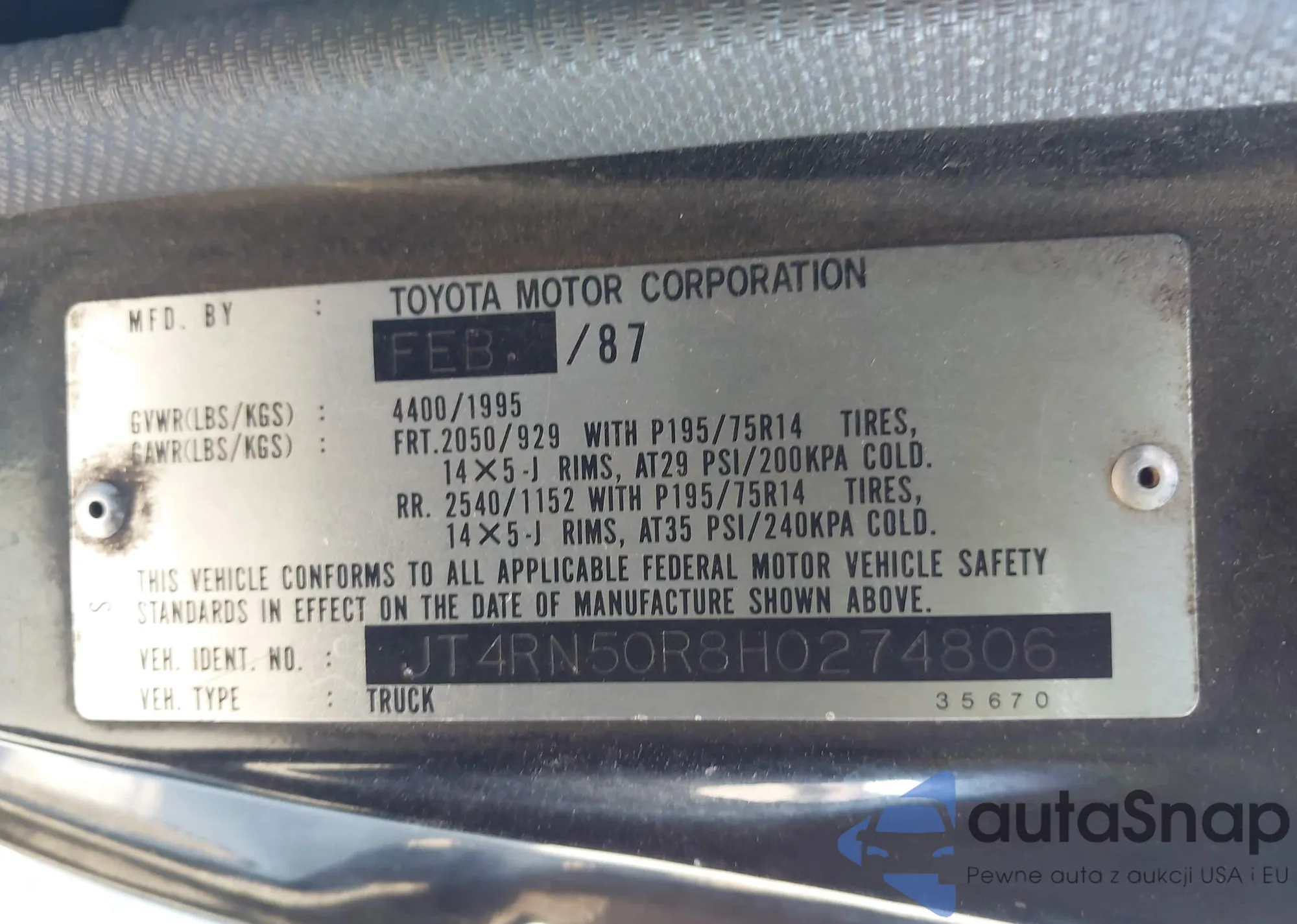 The car Toyota Pickup 1987 (VIN JT4RN50R8H0274806) has documents that prevent registration. Export and registration may be difficult. Contact AutaSnap experts to find alternatives.