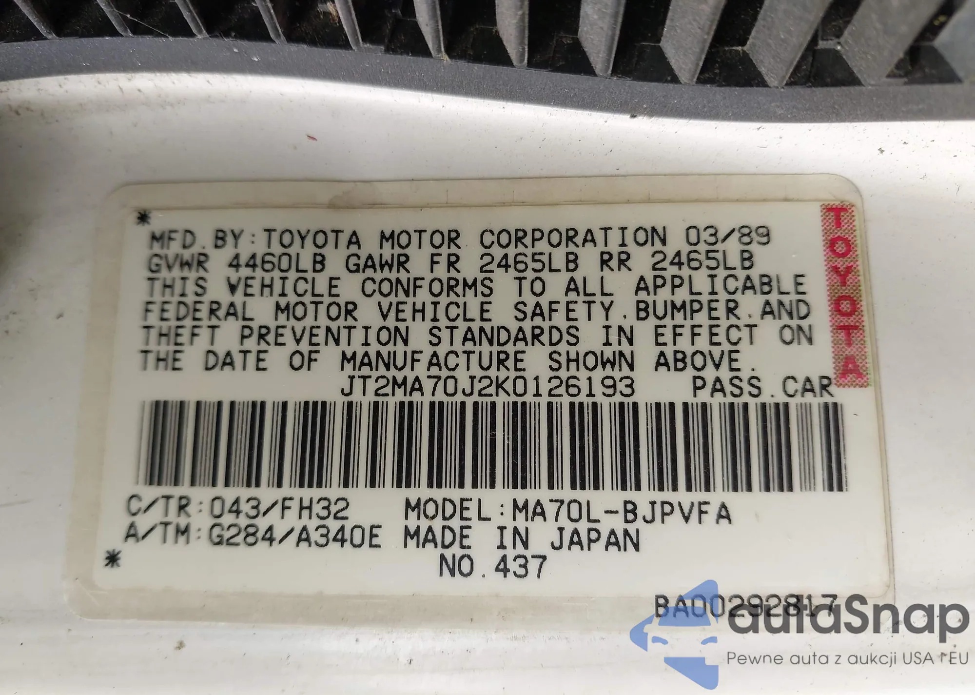 The car Toyota Supra 1989 (VIN JT2MA70J2K0126193) has documents that prevent registration. Export and registration may be difficult. Contact AutaSnap experts to find alternatives.