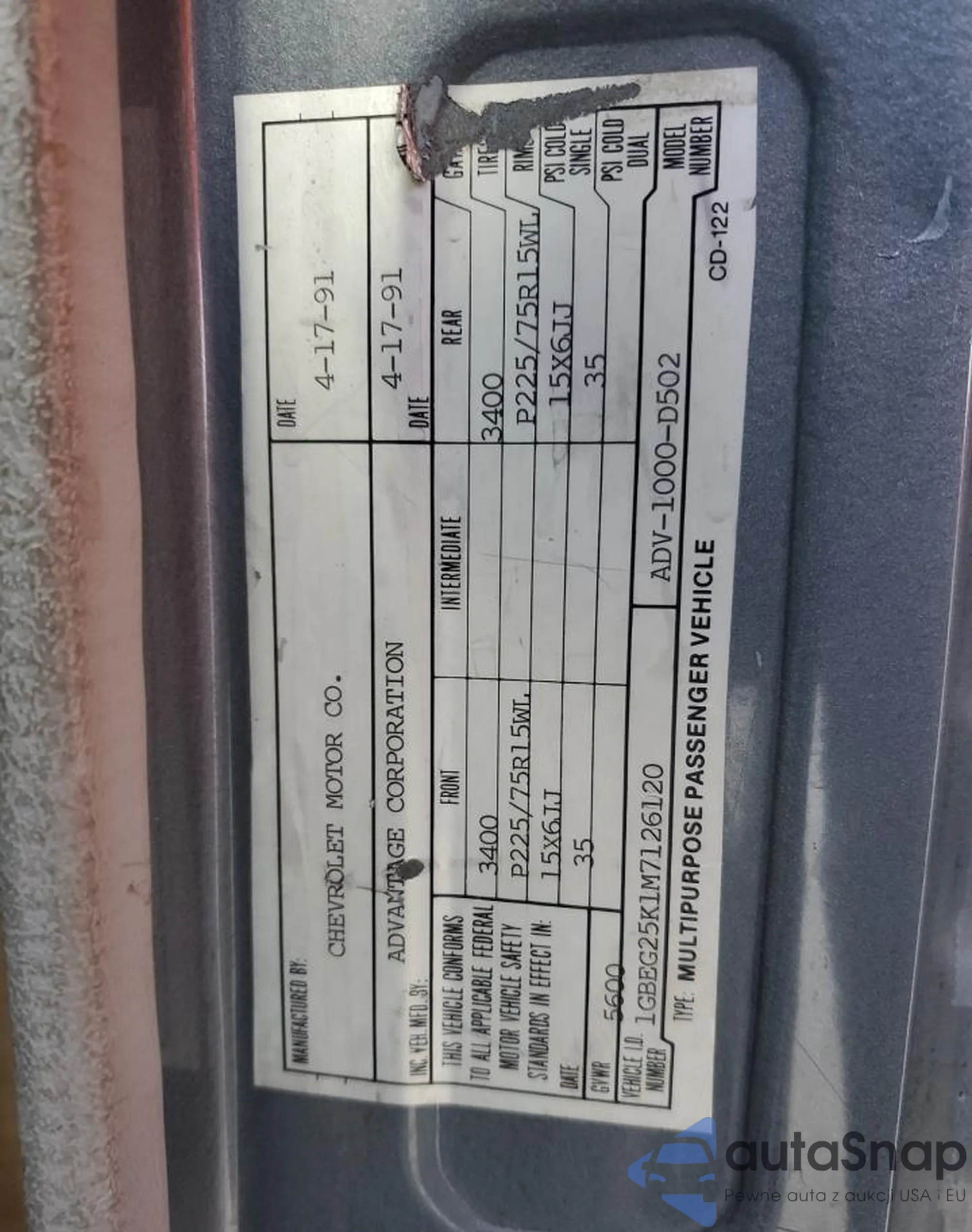 The car Chevrolet Van 1991 (VIN 1GBEG25K1M7126120) is sold by an unverified seller. We recommend checking the Carfax report and confirming registration possibilities before purchase.