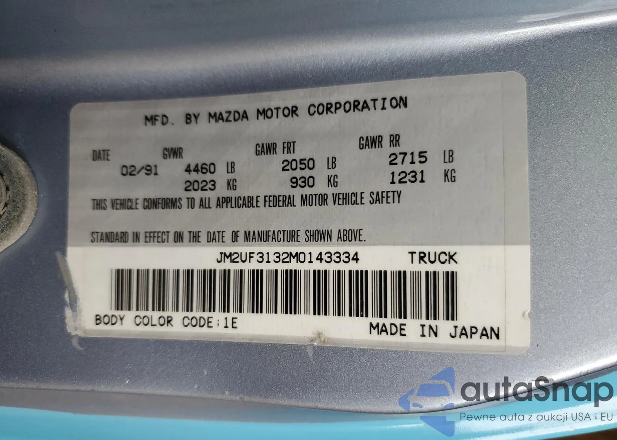 The car Mazda B-series 1991 (VIN JM2UF3132M0143334) has documents that prevent registration. Export and registration may be difficult. Contact AutaSnap experts to find alternatives.