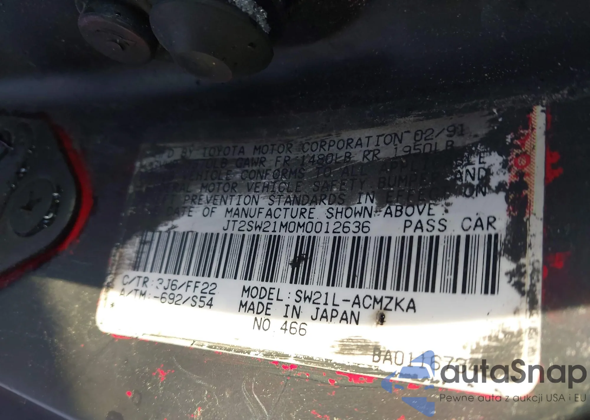 The car Toyota MR2 1991 (VIN JT2SW21M7M0003187) has documents that prevent registration. Export and registration may be difficult. Contact AutaSnap experts to find alternatives.
