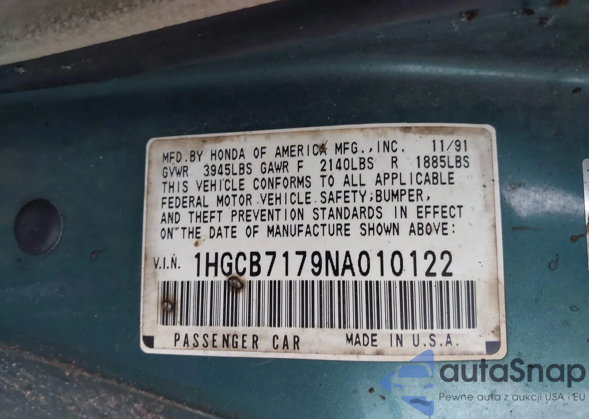 The car Honda Accord 1992 (VIN 1HGCB7179NA010122) has documents that prevent registration. Export and registration may be difficult. Contact AutaSnap experts to find alternatives.