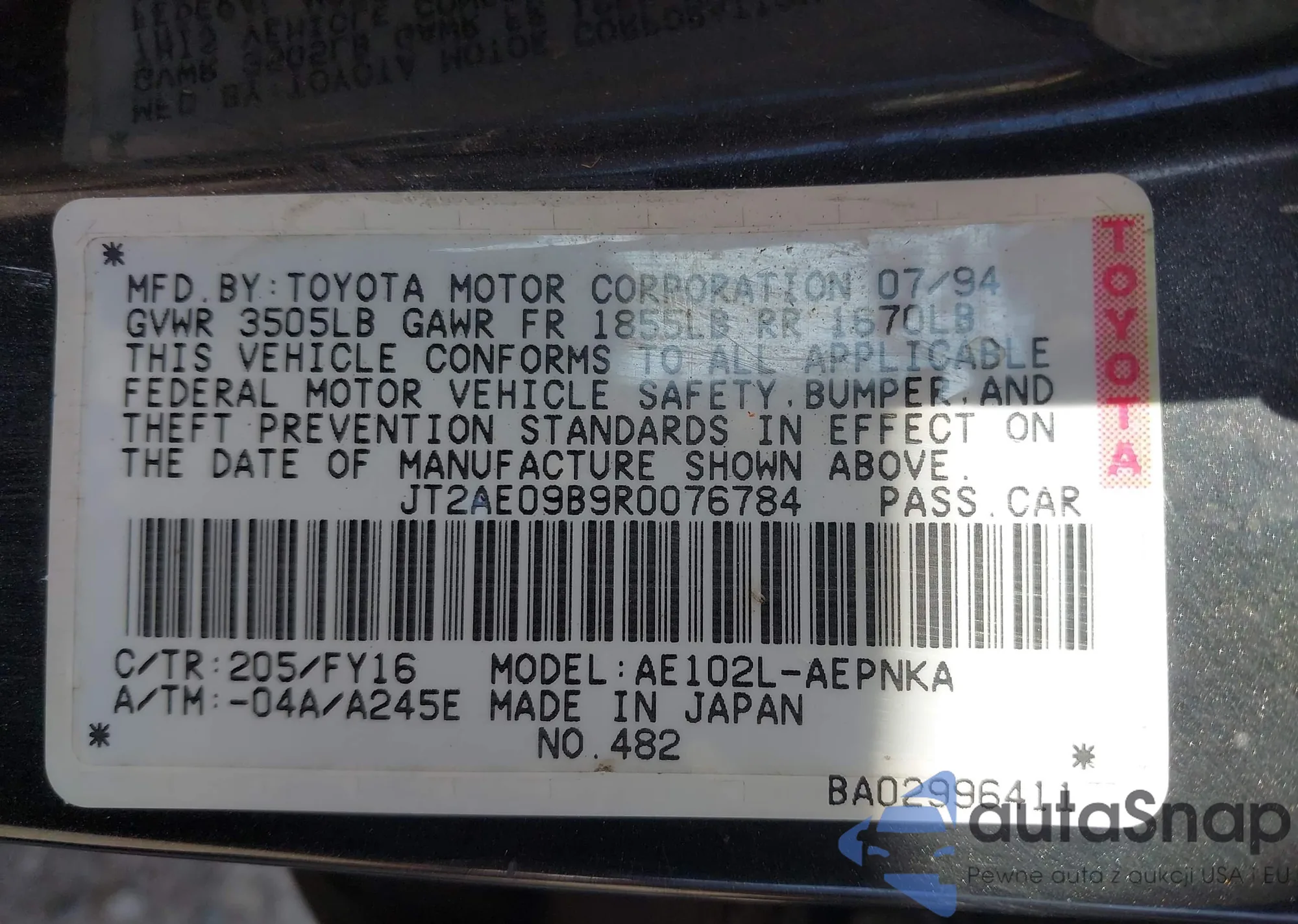 VIN: JT2AE09B9R0076784