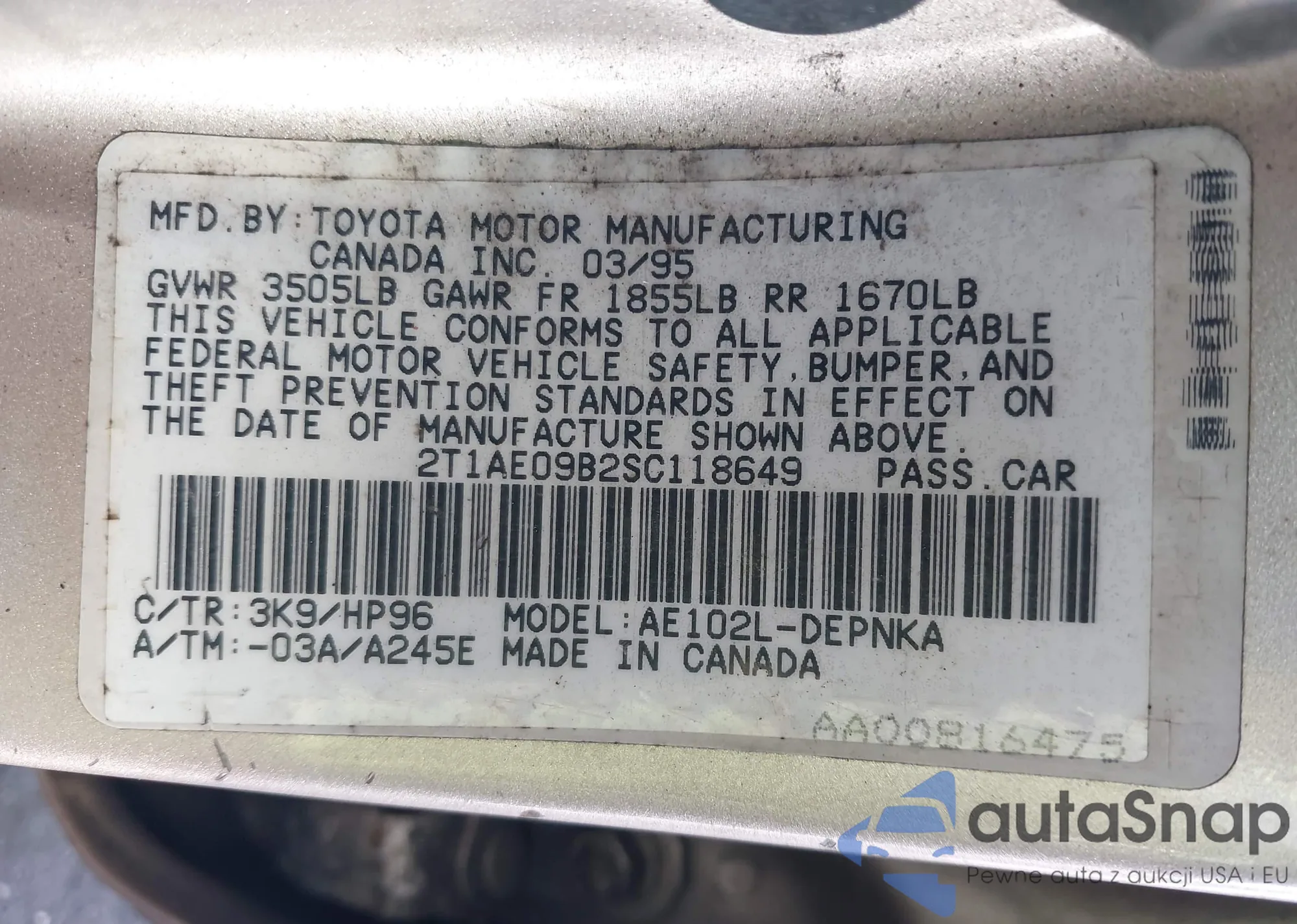 VIN: 2T1AE09B2SC118649