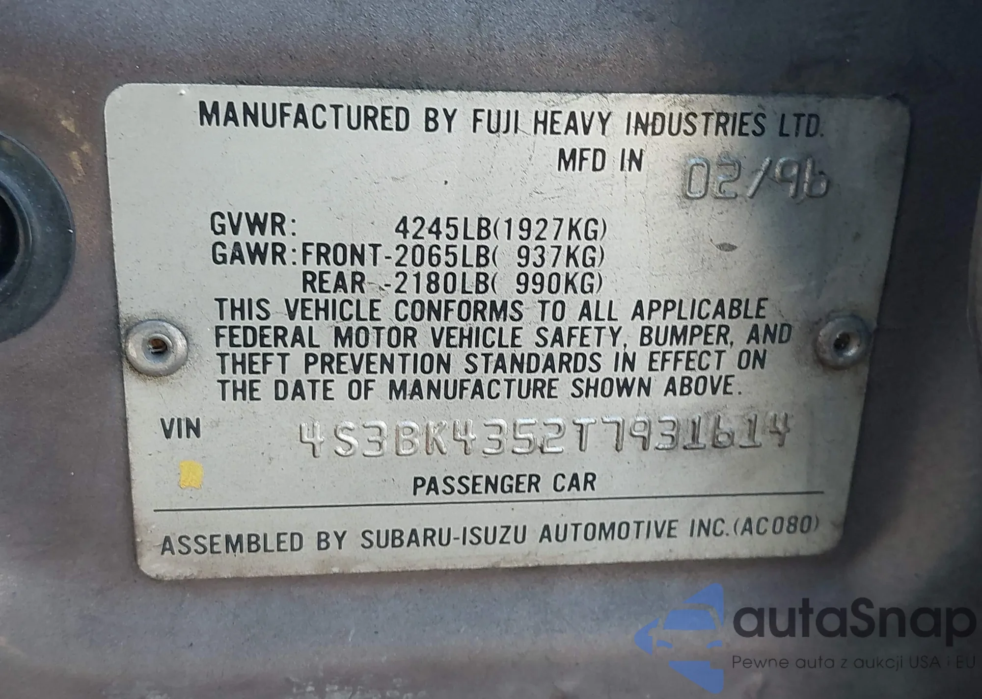 VIN: 4S3BK4352T7931614