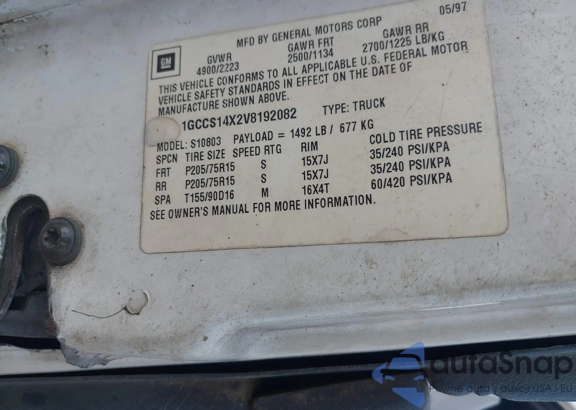VIN: 1GCCS14X2V8192082