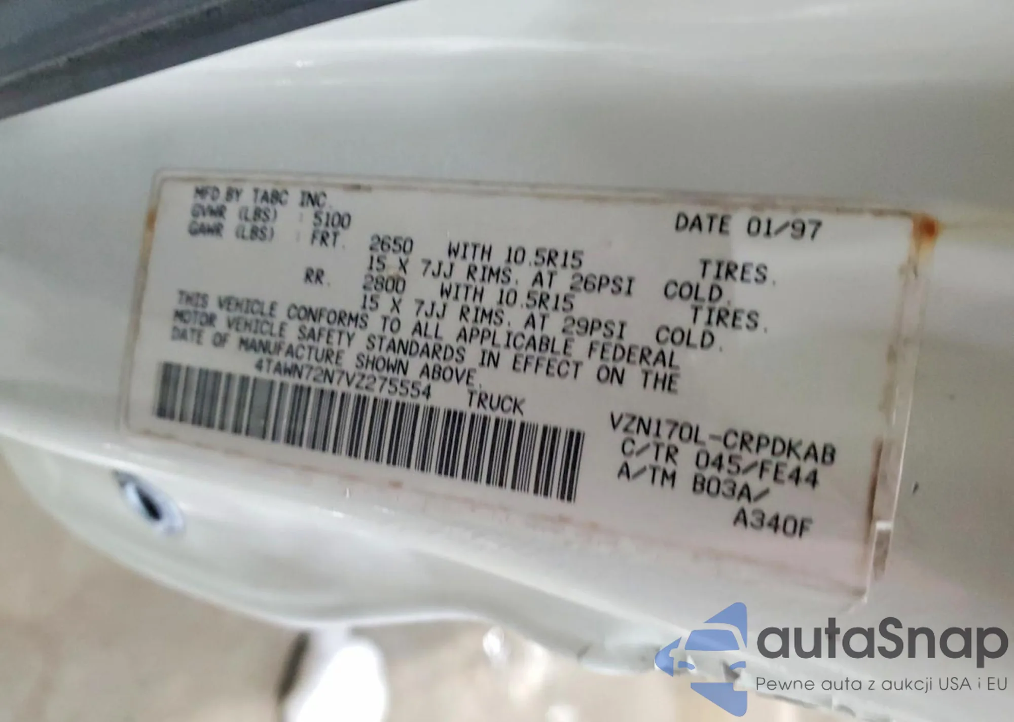 The car Toyota Tacoma 1997 (VIN 4TAWN72N7VZ275554) is sold by an unverified seller. We recommend checking the Carfax report and confirming registration possibilities before purchase.