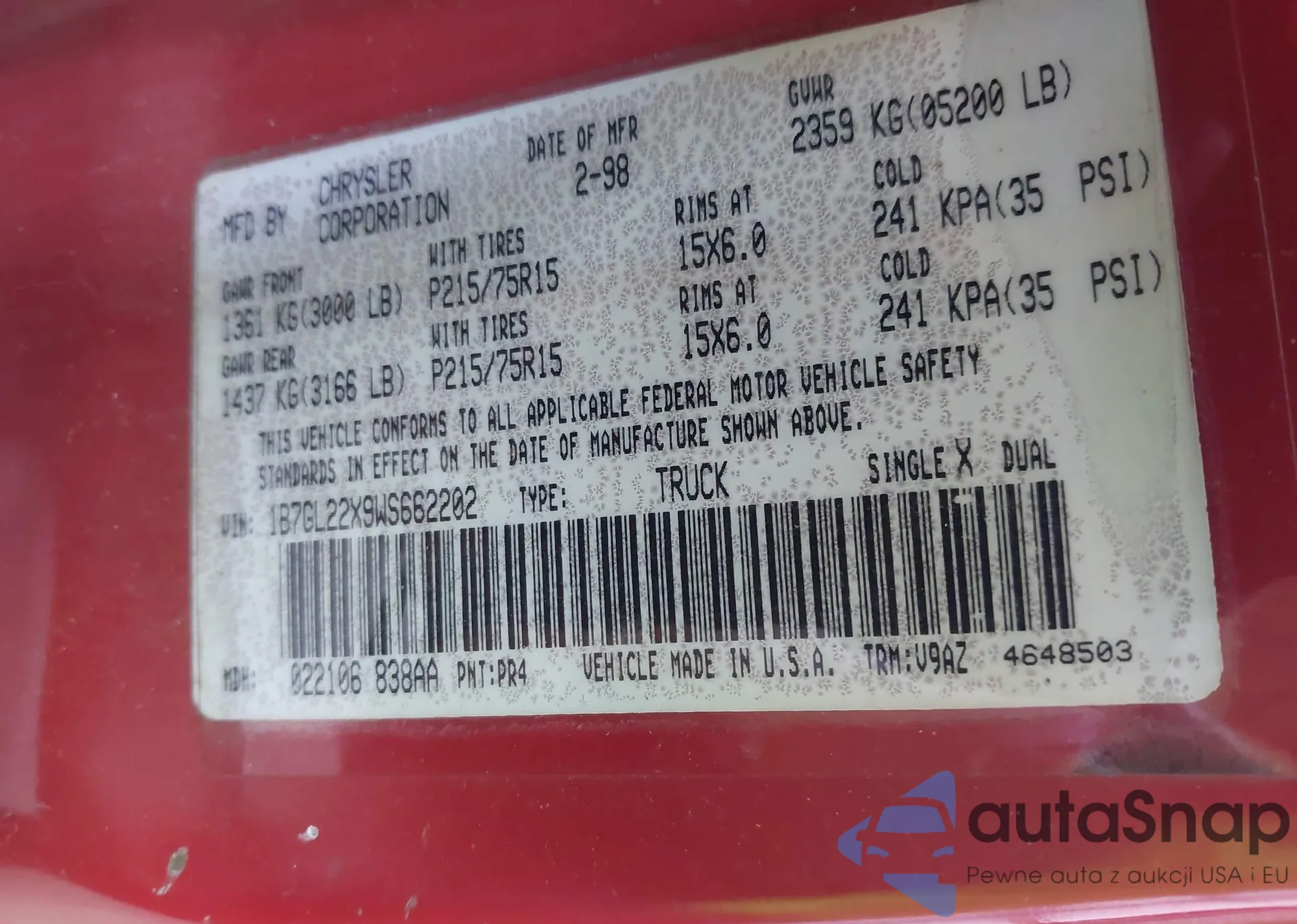 VIN: 1B7GL22X9WS662202