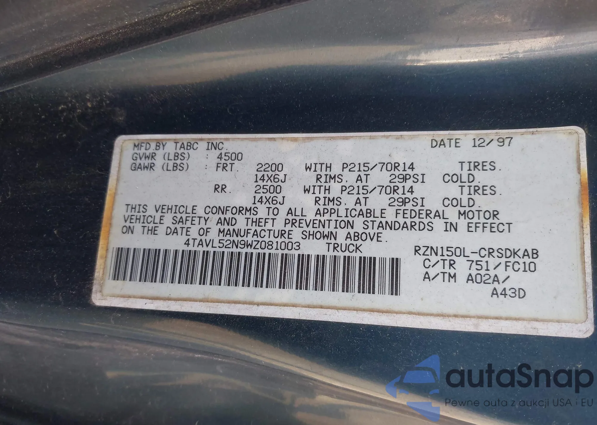 • VIN: 4TAVL52N9WZ081003
