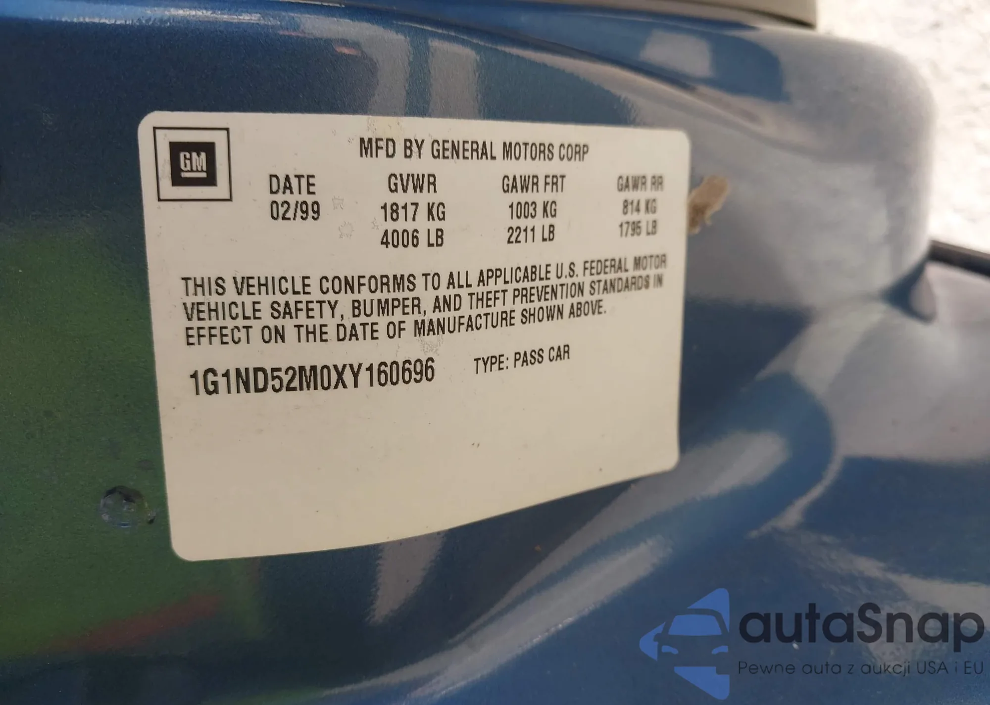 The car Chevrolet Malibu 1999 (VIN 1G1ND52MOXY160696) has documents that prevent registration. Export and registration may be difficult. Contact AutaSnap experts to find alternatives.
