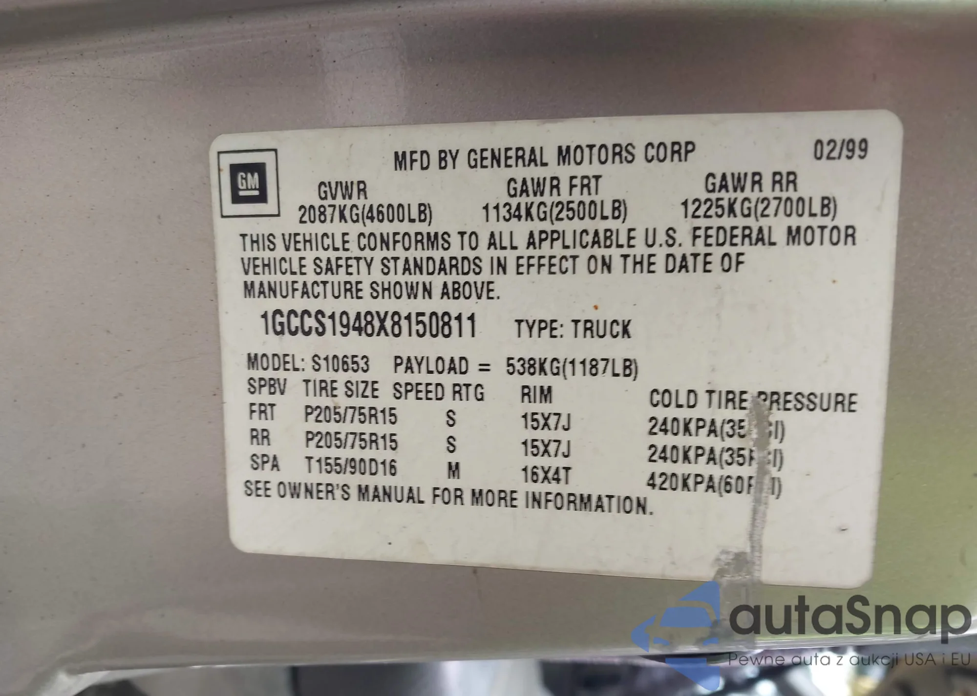 VIN: 1GCCS1948X8150811