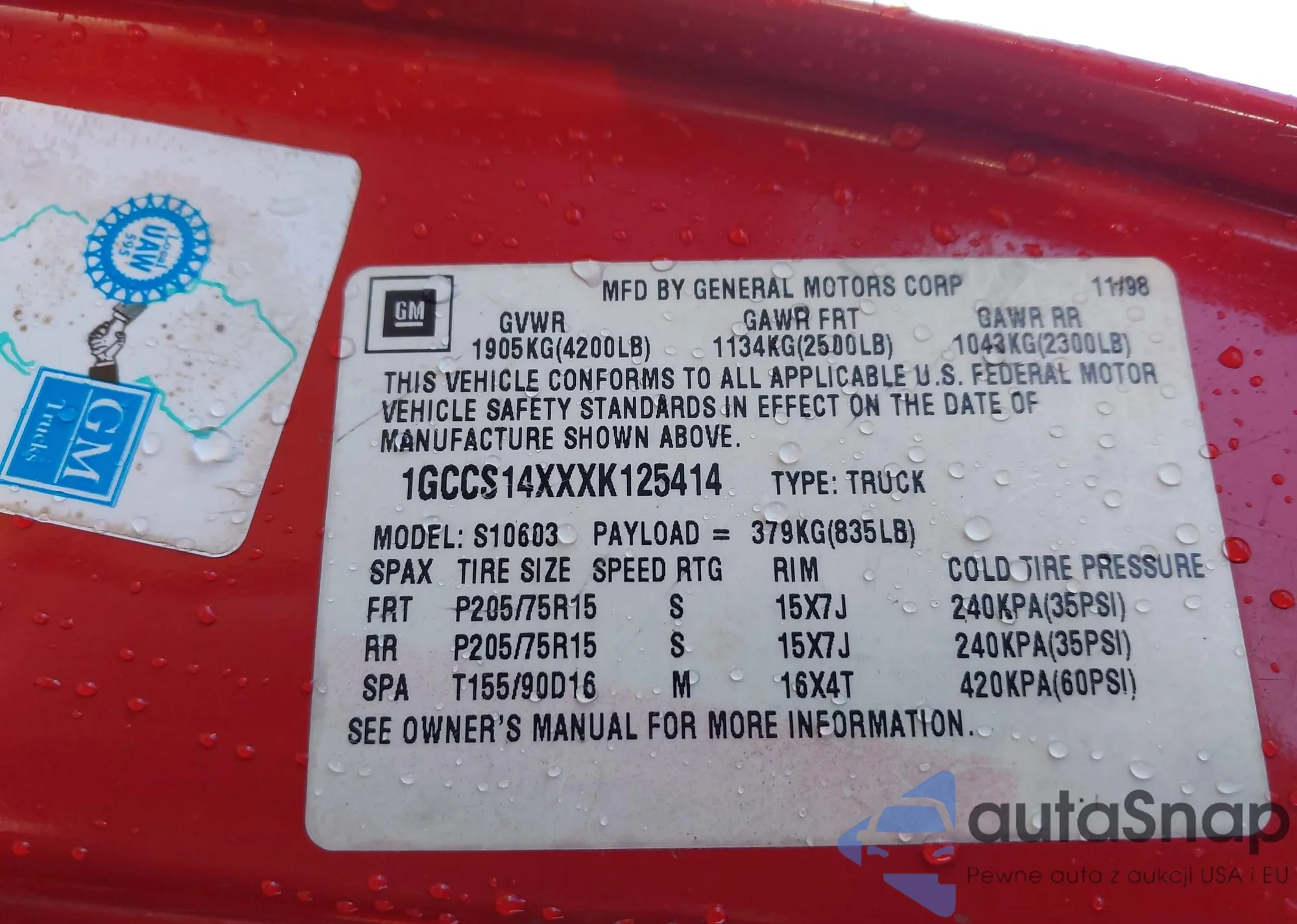 VIN: 1GCCS14XXXK125414