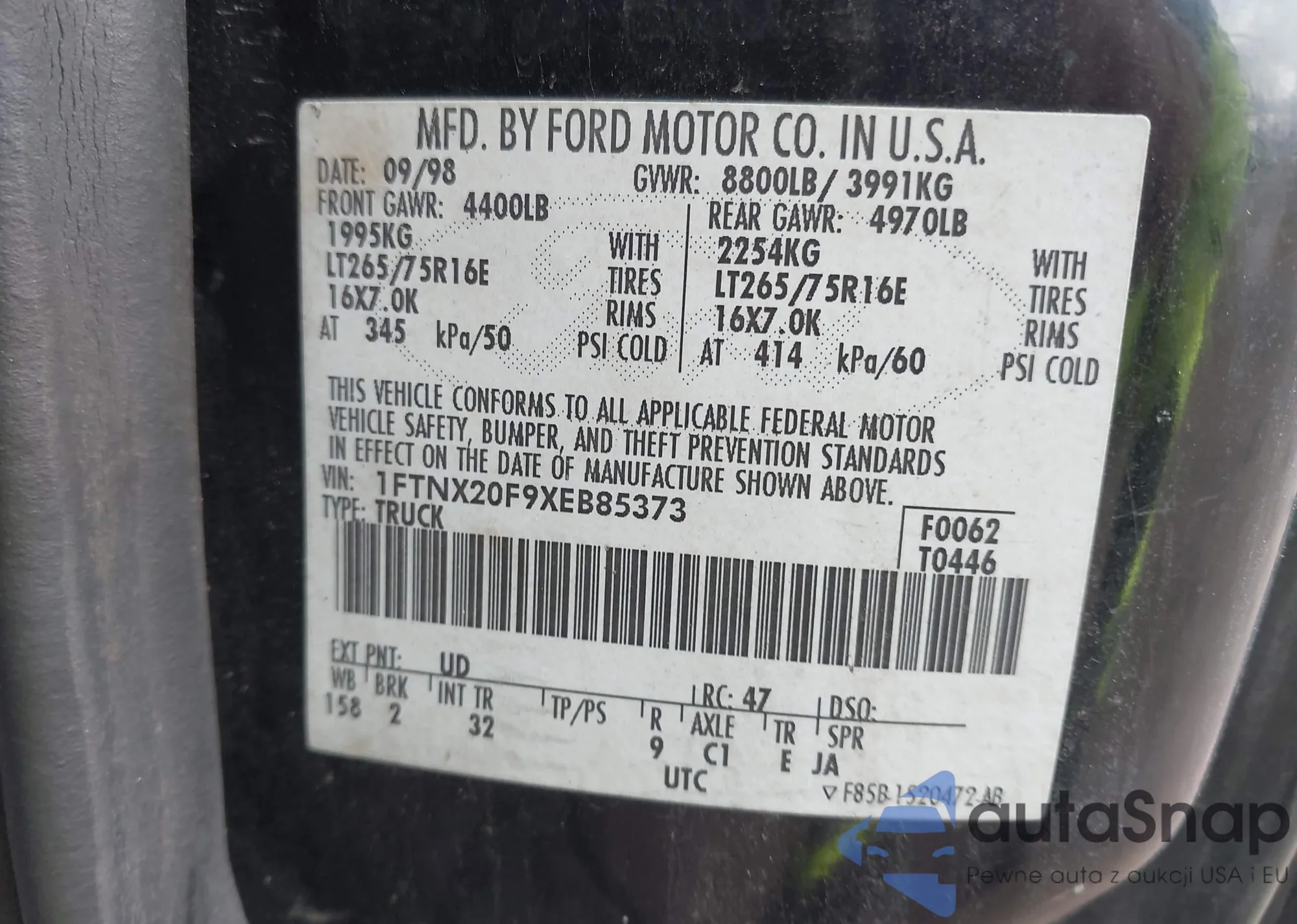The car Ford F250 1999 (VIN 1FTNX20F9XEB85373) has not been auctioned before. The documents are clean, and the mileage matches or is below the market average. Sold by an insurance company – we recommend purchase. Delivery to the port will take approx. 6–8 weeks.