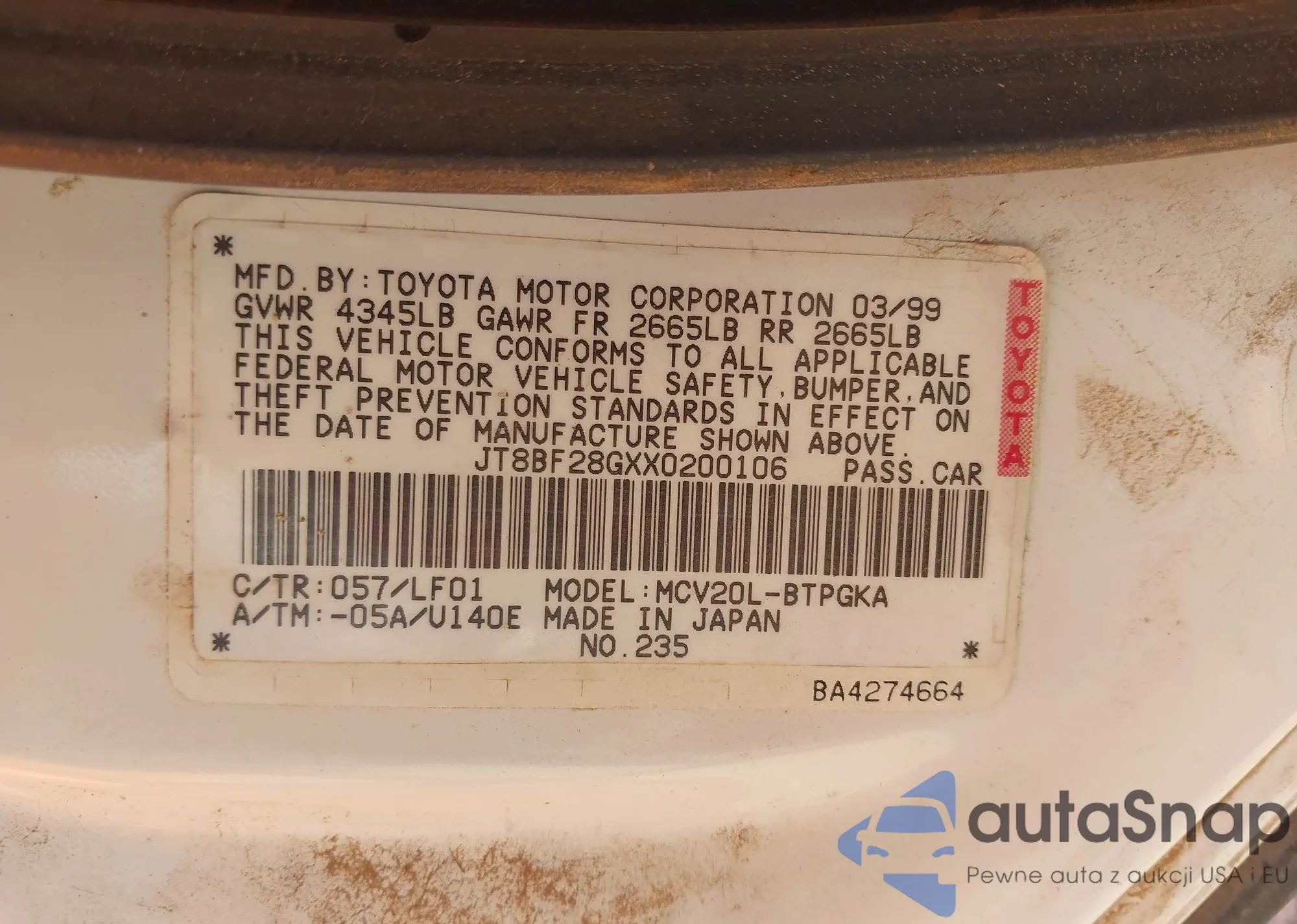 VIN: JT8BF28GXX0200106