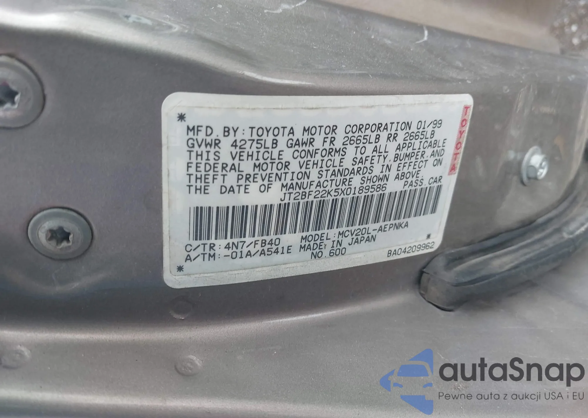 The car Toyota Camry 1999 (VIN JT2BF22K5X0189586) has not been auctioned before. The documents are clean, and the mileage matches or is below the market average. Sold by an insurance company – we recommend purchase. Delivery to the port will take approx. 6–8 weeks.