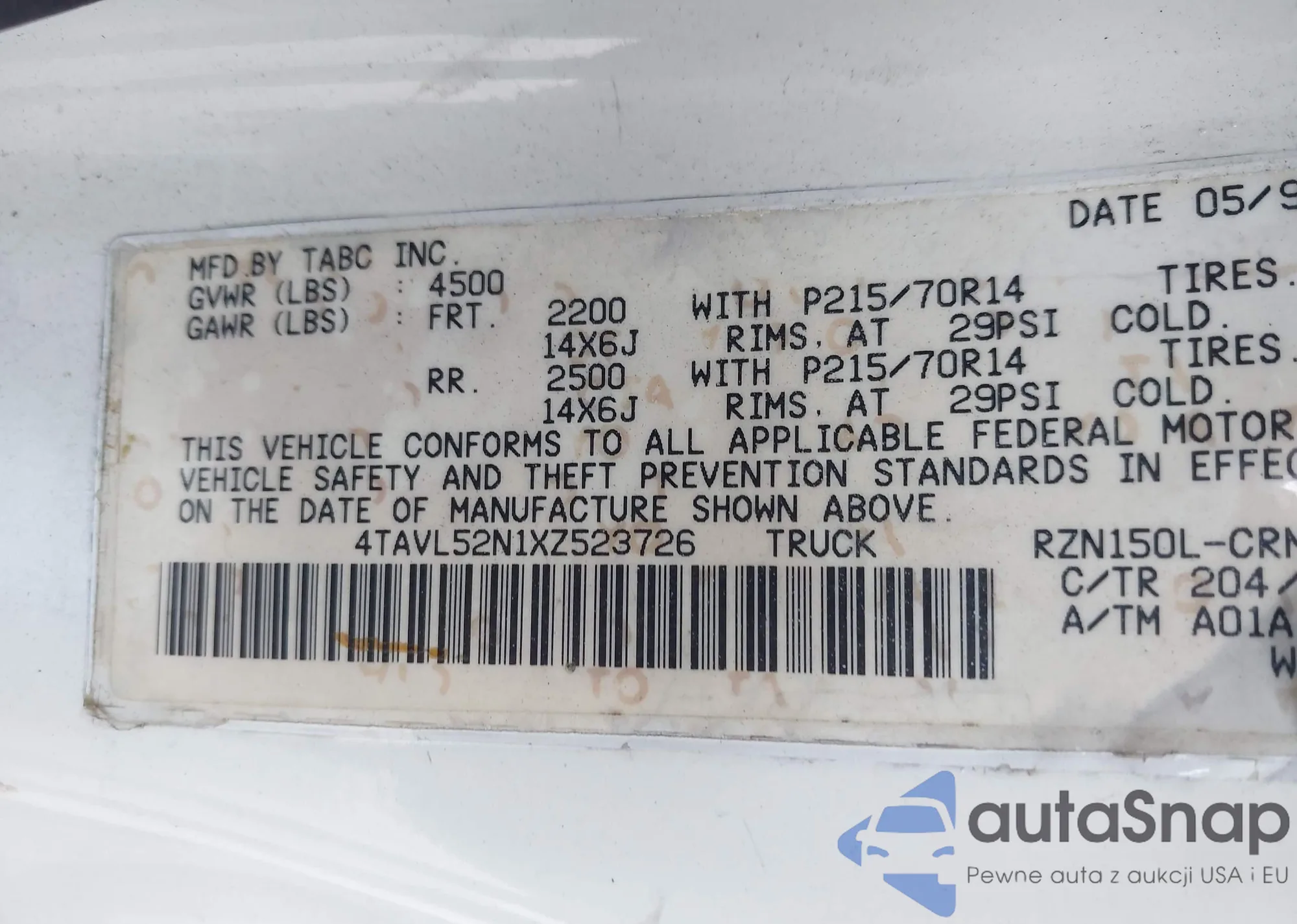 • VIN: 4TAVL52N1XZ523726