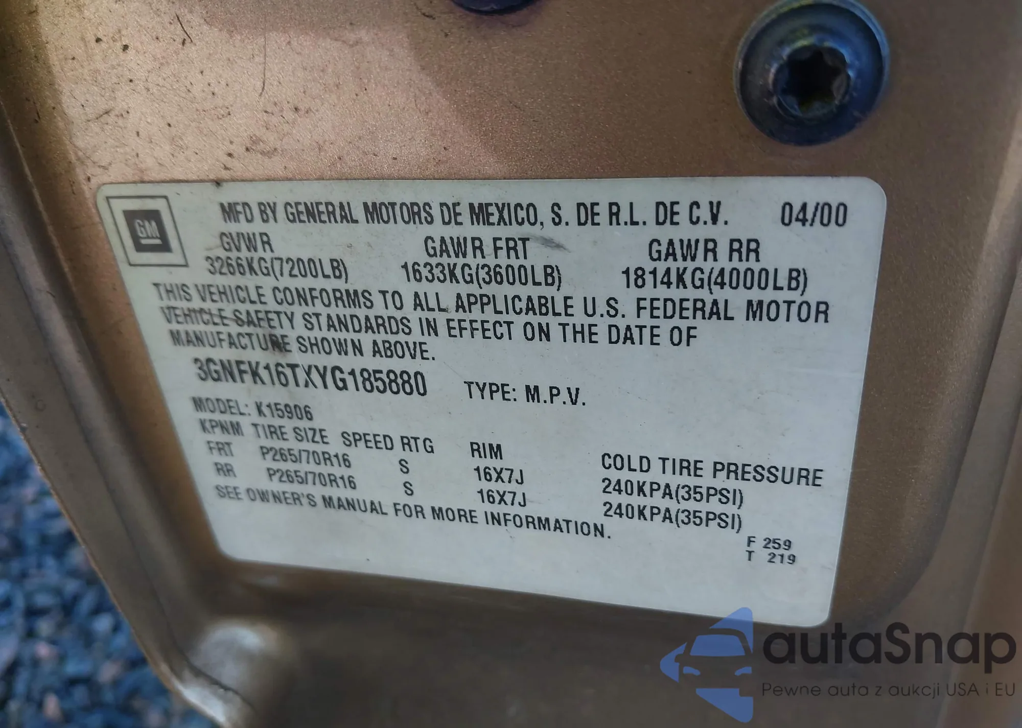 • VIN: 3GNFK16TXYG185880