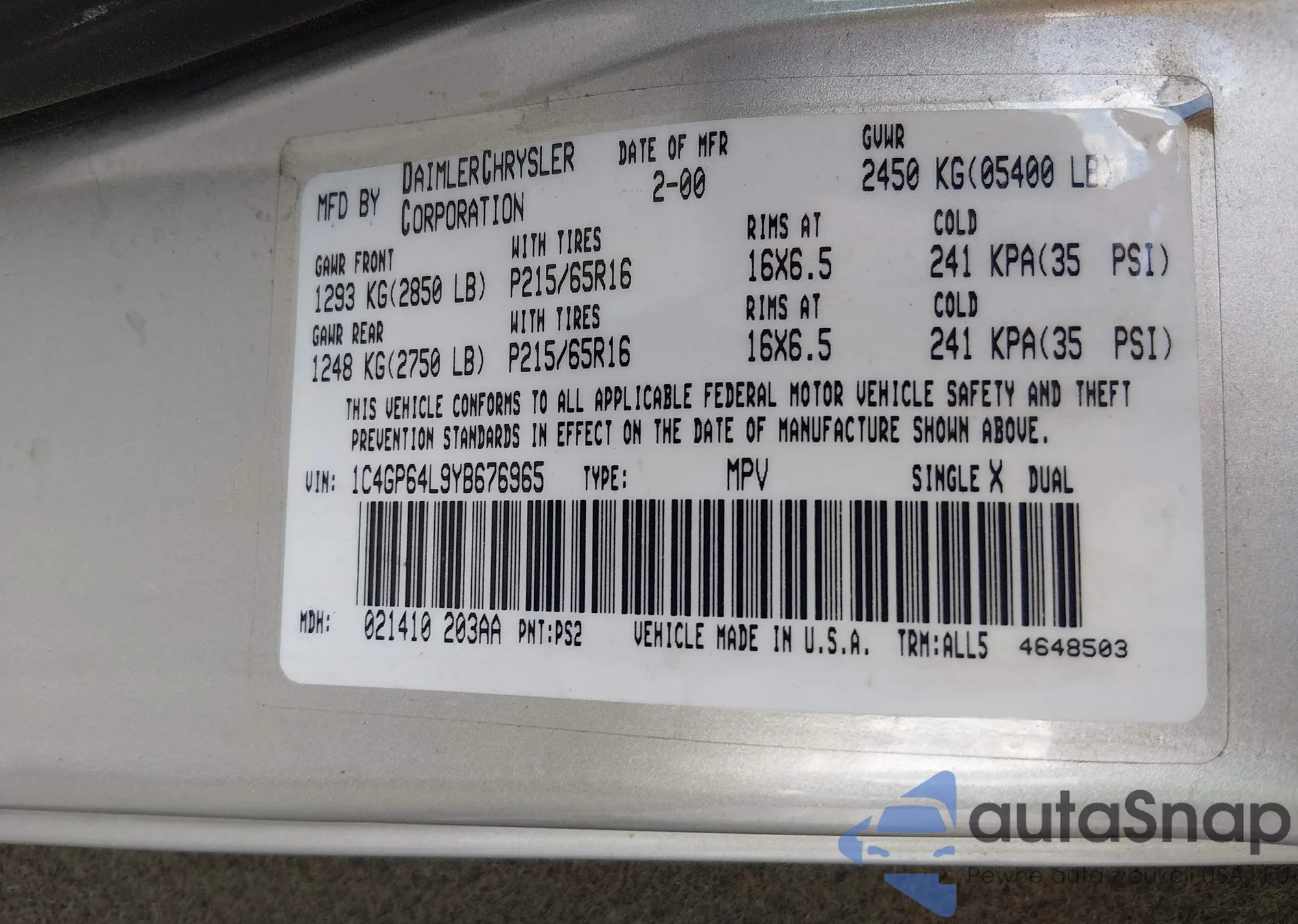 The car Chrysler Town & Country 2000 (VIN 1C4DP64L9YB676965) is sold by an unverified seller. We recommend checking the Carfax report and confirming registration possibilities before purchase.