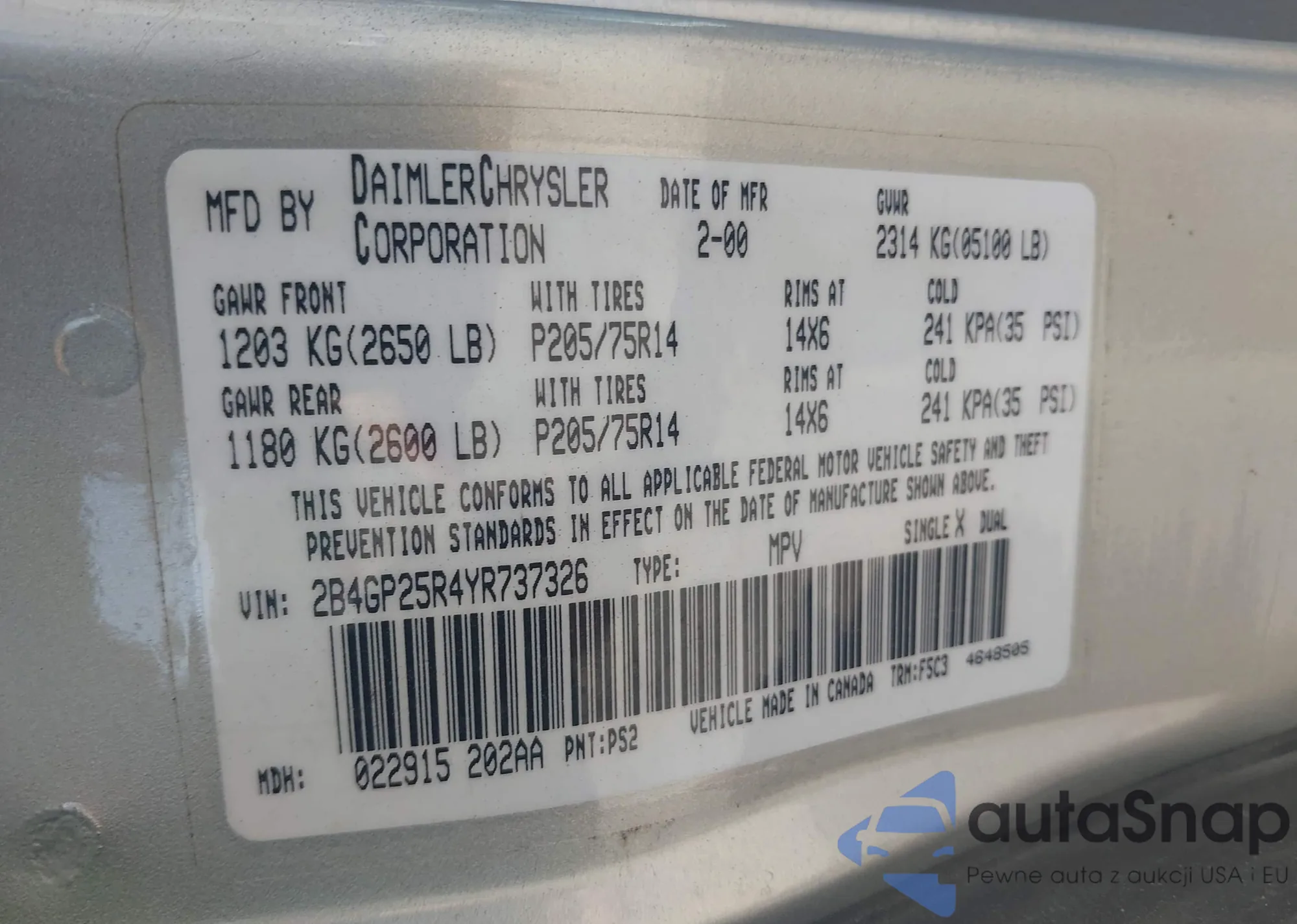 VIN: 2B4GP25R4YR737326